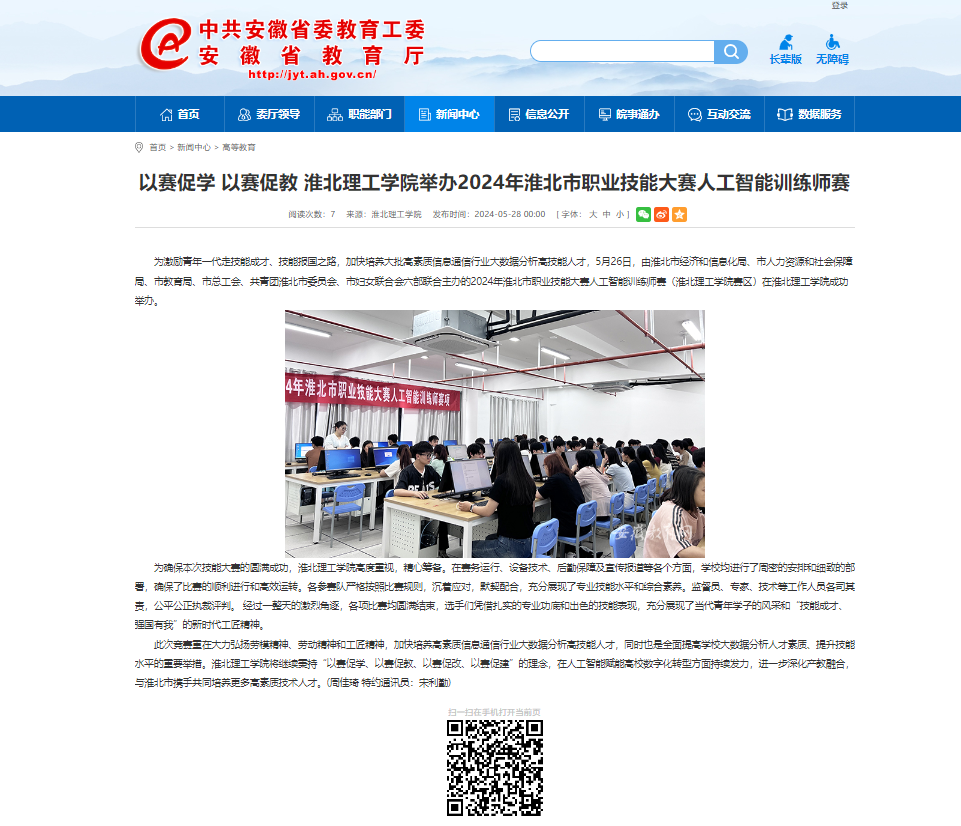 为激励青年一代走技能成才、技能报国之路,加快培养大批高素质信息通信行业大数据分析高技能人才,5月26日,由淮北市经济和信息化局、市人力资源和社会保障局、市教育局、市总工会、共青团淮北市委员会、市妇女联合会六部联合主办的2024年淮北市职业技能大赛人工智能训练师赛(beat365英国官方网站赛区)在beat365英国官方网站成功举办。对此,安徽教育网进行了报道: