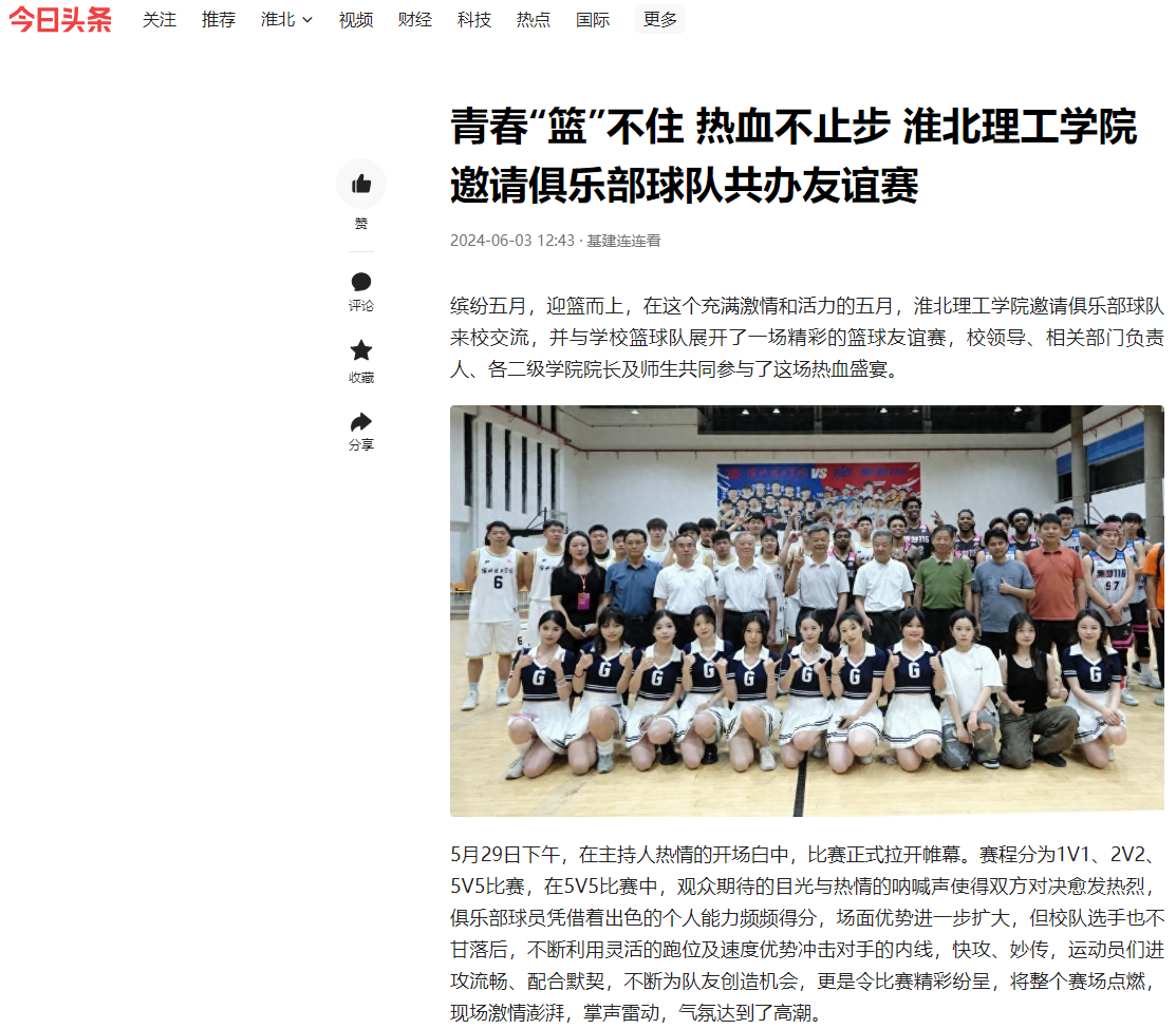 缤纷五月,迎篮而上,在这个充满激情和活力的五月,beat365英国官方网站邀请俱乐部球队来校交流,并与学校篮球队展开了一场精彩的篮球友谊赛,校领导、相关部门负责人、各二级学院院长及师生共同参与了这场热血盛宴。对此,今日头条进行了报道: