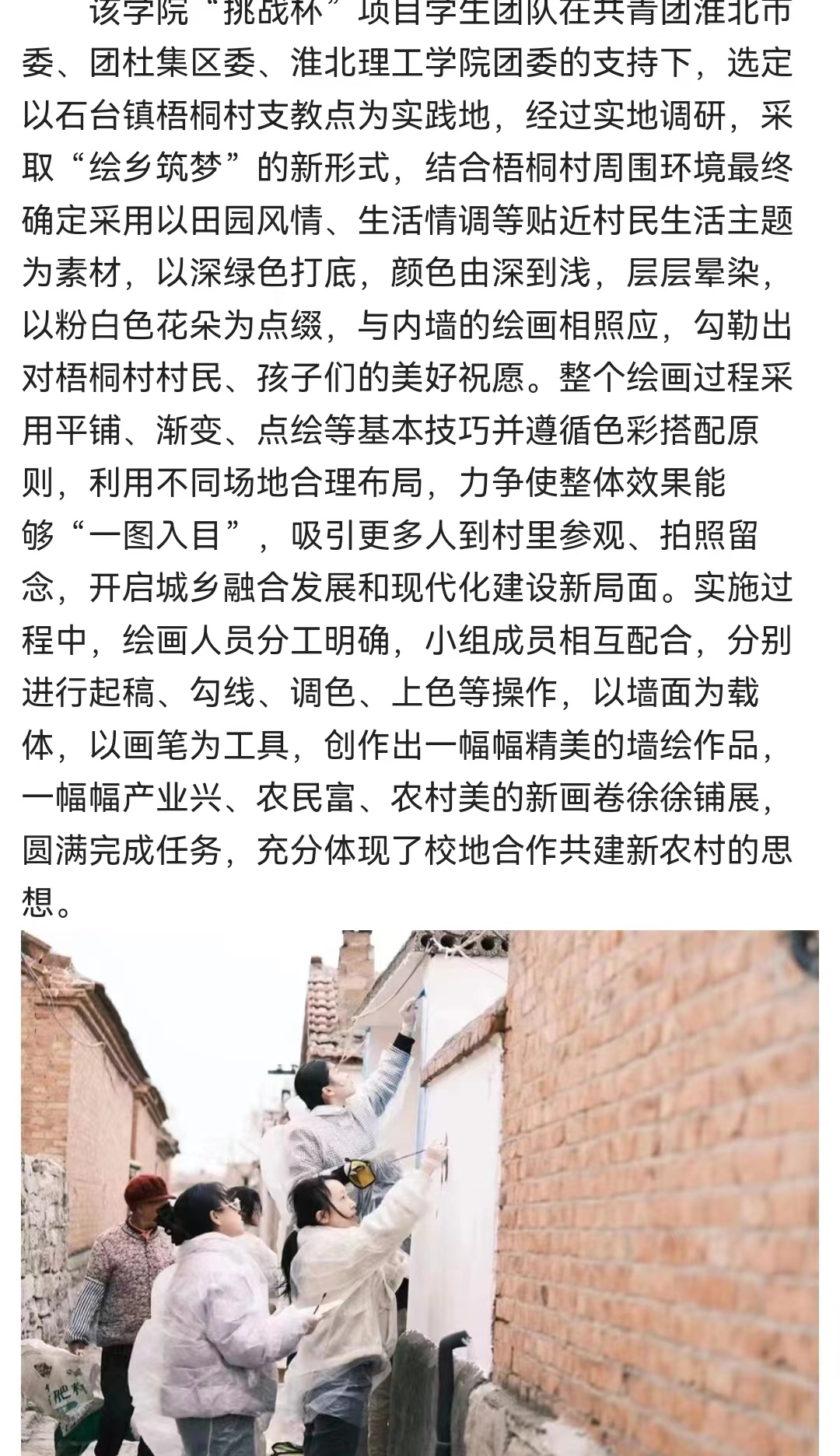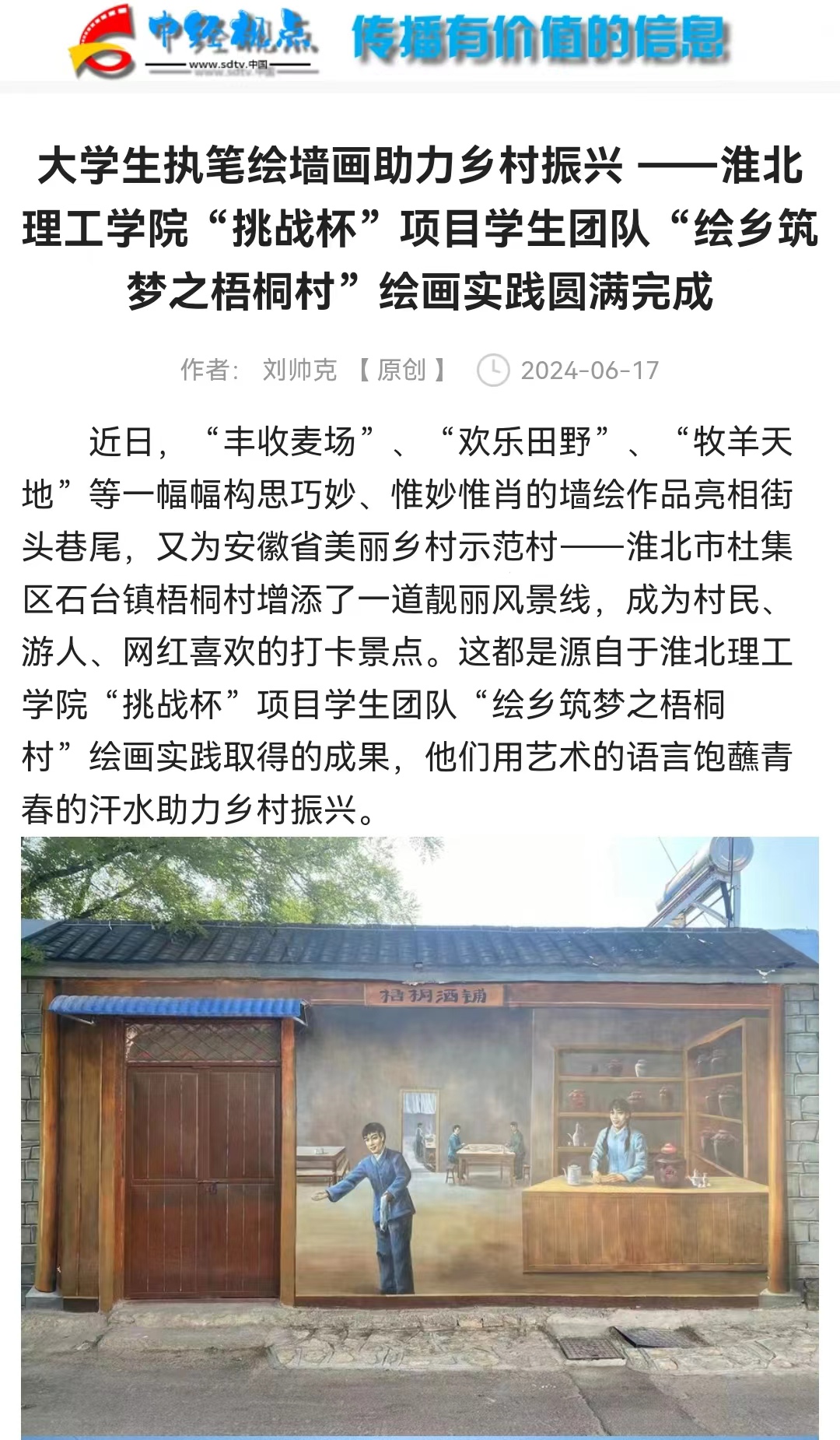 近日,“丰收麦场”、“欢乐田野”、“牧羊天地”等一幅幅构思巧妙、惟妙惟肖的墙绘作品亮相街头巷尾,又为安徽省美丽乡村示范村——淮北市杜集区石台镇梧桐村增添了一道靓丽风景线,成为村民、游人、网红喜欢的打卡景点。对此,中经视点进行了报道: