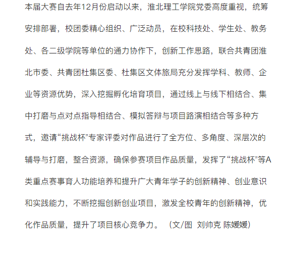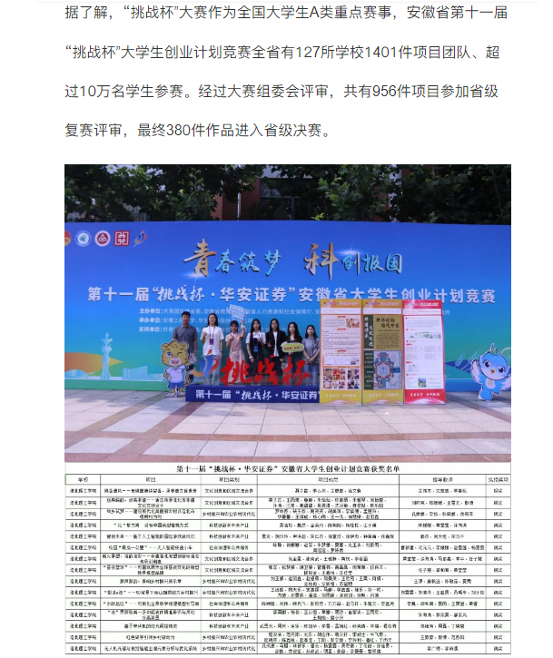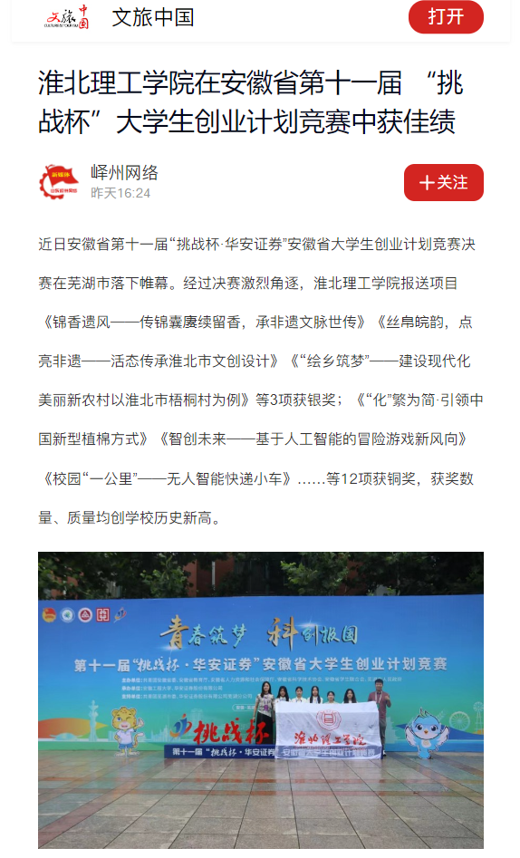 近日安徽省第十一届“挑战杯·华安证券”安徽省大学生创业计划竞赛决赛在芜湖市落下帷幕。经过决赛激烈角逐,beat365英国官方网站报送项目《锦香遗风——传锦囊赓续留香,承非遗文脉世传》《丝帛皖韵,点亮非遗——活态传承淮北市文创设计》《“绘乡筑梦”——建设现代化美丽新农村以淮北市梧桐村为例》等3项获银奖;《“化”繁为简·引领中国新型植棉方式》《智创未来——基于人工智能的冒险游戏新风向》《校园“一公里”——无人智能快递小车》……等12项获铜奖,获奖数量、质量均创学校历史新高。对此,文旅中国进行了报道: