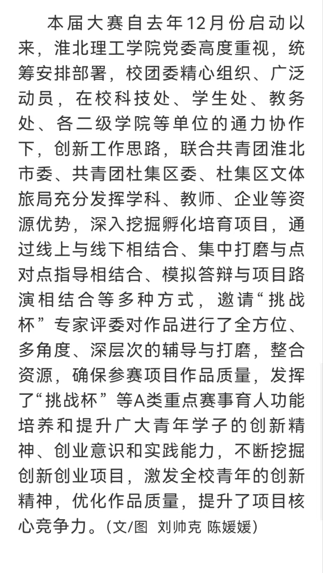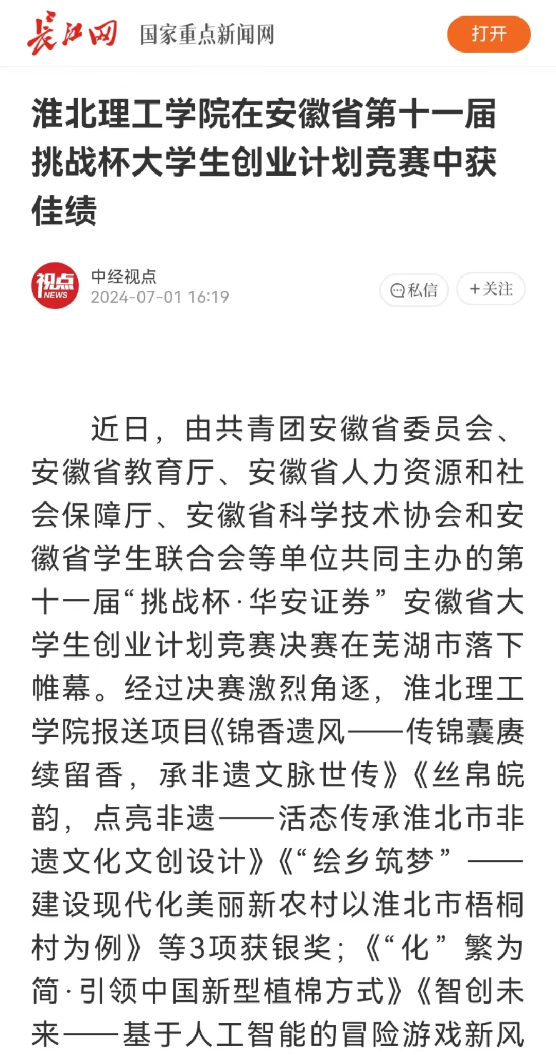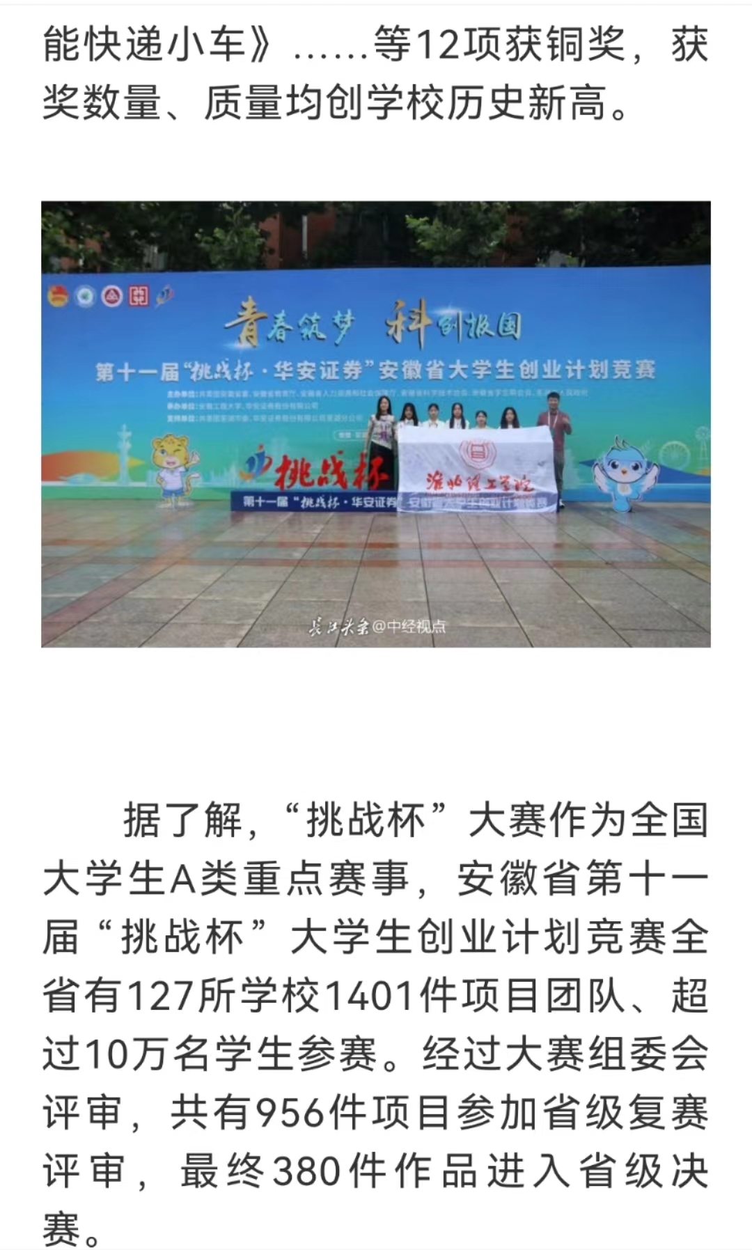 近日,由共青团安徽省委员会、安徽省教育厅、安徽省人力资源和社会保障厅、安徽省科学技术协会和安徽省学生联合会等单位共同主办的第十一届“挑战杯·华安证券”安徽省大学生创业计划竞赛决赛在芜湖市落下帷幕。经过决赛激烈角逐,beat365英国官方网站报送项目《锦香遗风——传锦囊赓续留香,承非遗文脉世传》《丝帛皖韵,点亮非遗——活态传承淮北市非遗文化文创设计》《“绘乡筑梦”——建设现代化美丽新农村以淮北市梧桐村为例》等3项获银奖;《“化”繁为简·引领中国新型植棉方式》《智创未来——基于人工智能的冒险游戏新风向》《校园“最后一公里”——无人智能快递小车》……等12项获铜奖,获奖数量、质量均创学校历史新高。对此,长江网进行了报道: