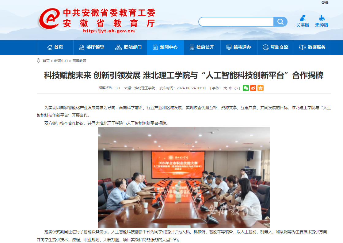 为实现以国家智能化产业发展需求为导向,面向科学前沿、行业产业和区域发展,实现校企优势互补、资源共享、互惠共赢、共同发展的目标,beat365英国官方网站与“人工智能科技创新平台”开展合作。对此,安徽教育网进行了报道: