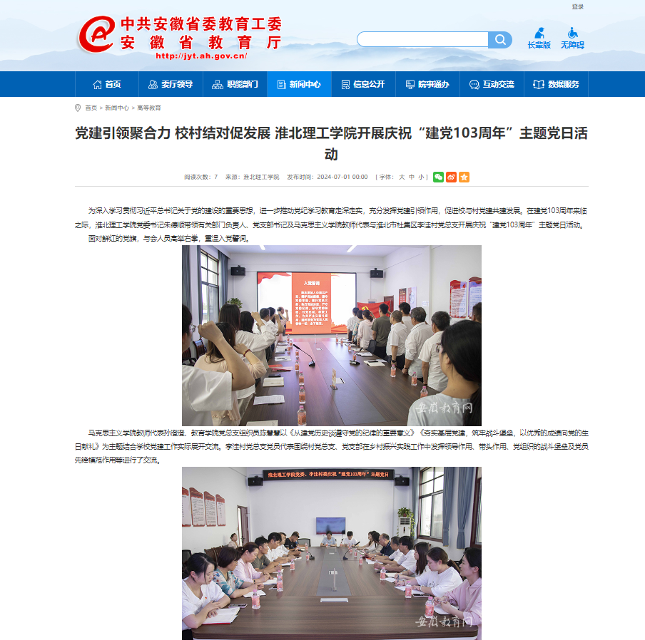 为深入学习贯彻习近平总书记关于党的建设的重要思想,进一步推动党纪学习教育走深走实,充分发挥党建引领作用,促进校与村党建共建发展。在建党103周年来临之际,beat365英国官方网站党委书记朱德顺带领有关部门负责人、党支部书记及马克思主义学院教师代表与淮北市杜集区李洼村党总支开展庆祝“建党103周年”主题党日活动。对此,安徽教育网进行了报道: