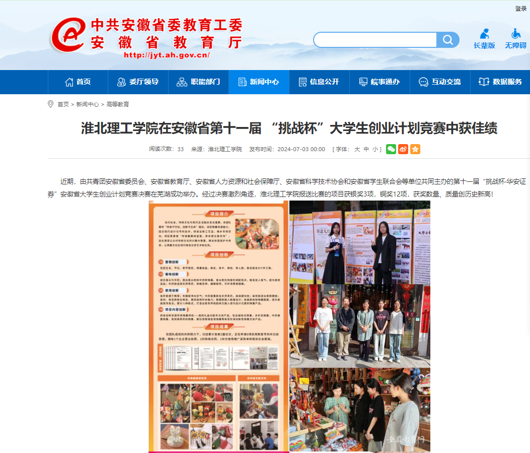 近期,由共青团安徽省委员会、安徽省教育厅、安徽省人力资源和社会保障厅、安徽省科学技术协会和安徽省学生联合会等单位共同主办的第十一届“挑战杯·华安证券”安徽省大学生创业计划竞赛决赛在芜湖成功举办。经过决赛激烈角逐,beat365英国官方网站报送比赛的项目获银奖3项,铜奖12项,获奖数量、质量创历史新高!对此,安徽教育网进行了报道: