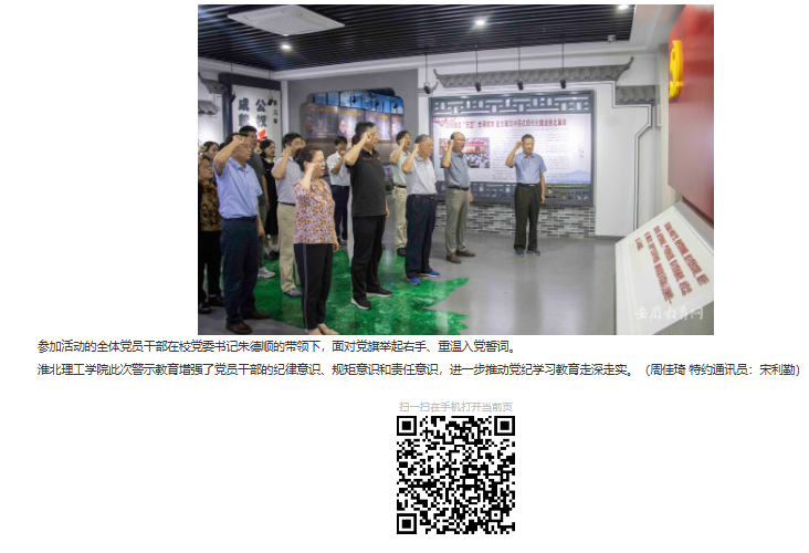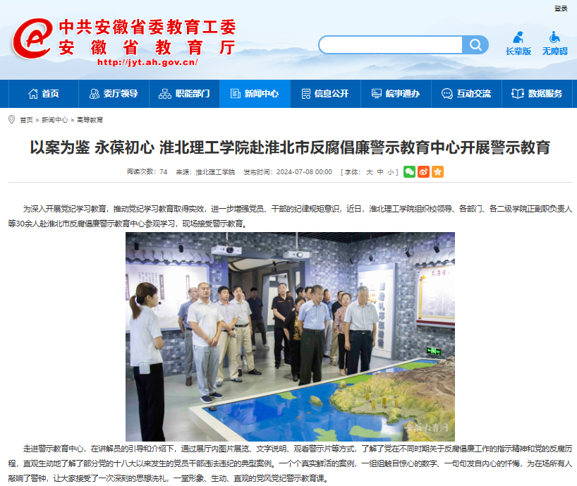 为深入开展党纪学习教育,推动党纪学习教育取得实效,进一步增强党员、干部的纪律规矩意识,近日,beat365英国官方网站组织校领导、各部门、各二级学院正副职负责人等30余人赴淮北市反腐倡廉警示教育中心参观学习,现场接受警示教育。安徽教育网首页对此进行了报道。