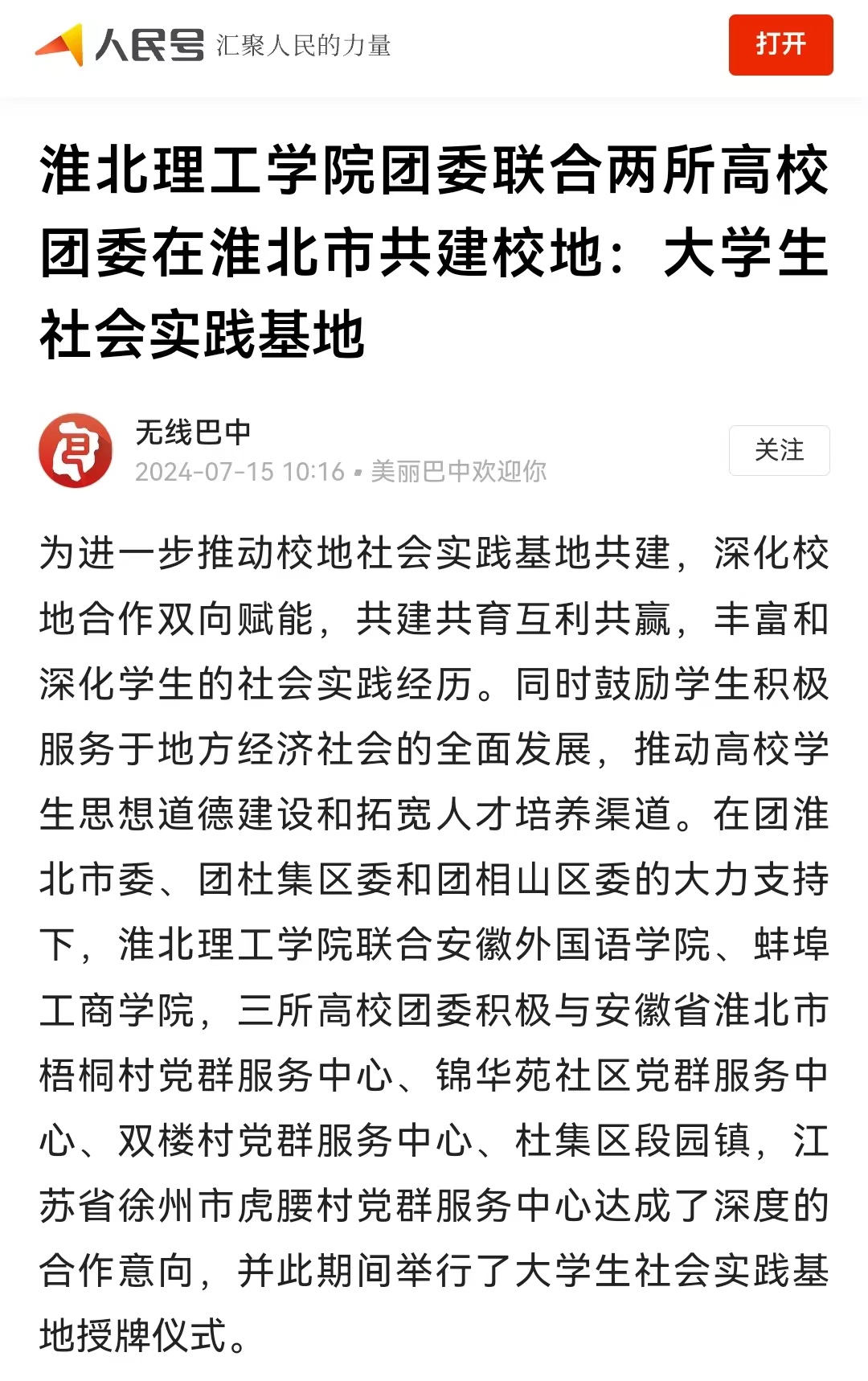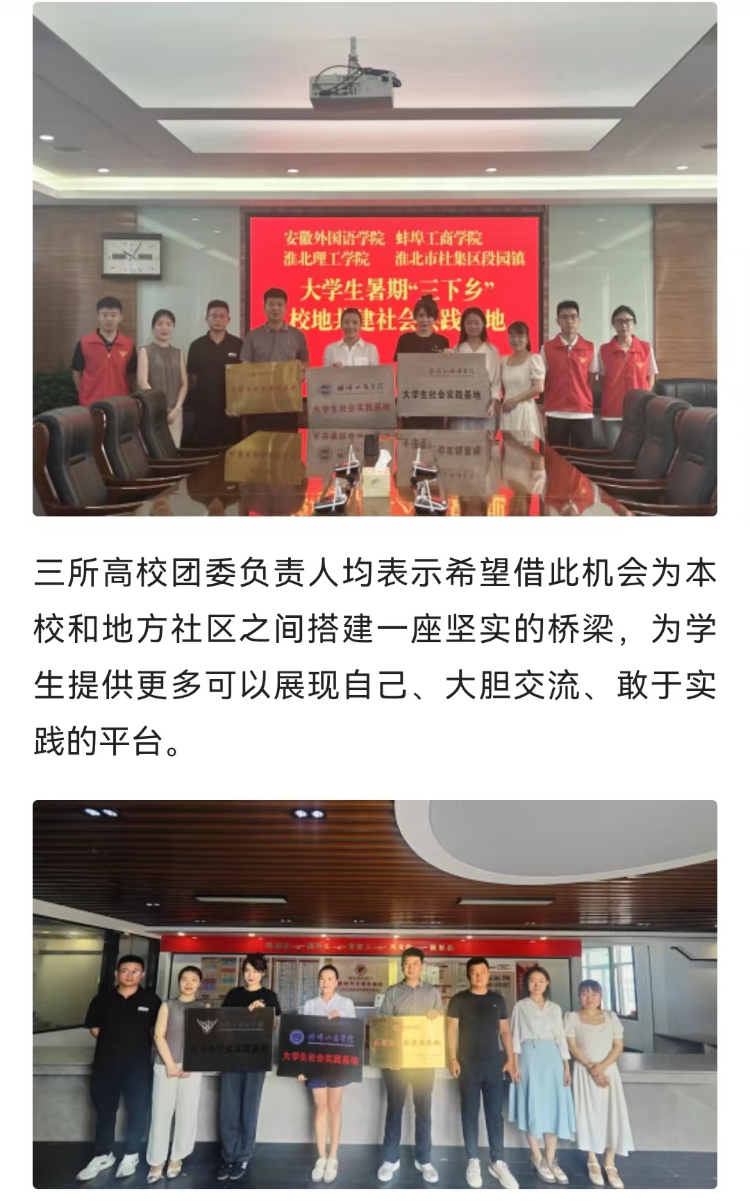为进一步推动校地社会实践基地共建,深化校地合作双向赋能,共建共育互利共赢,丰富和深化学生的社会实践经历。同时鼓励学生积极服务于地方经济社会的全面发展,推动高校学生思想道德建设和拓宽人才培养渠道。在团淮北市委、团杜集区委和团相山区委的大力支持下,beat365英国官方网站联合安徽外国语学院、蚌埠工商学院,三所高校团委积极与安徽省淮北市梧桐村党群服务中心、锦华苑社区党群服务中心、双楼村党群服务中心、杜集区段园镇,江苏省徐州市虎腰村党群服务中心达成了深度的合作意向,并此期间举行了大学生社会实践基地授牌仪式。对此,人民日报-人民号进行了报道: