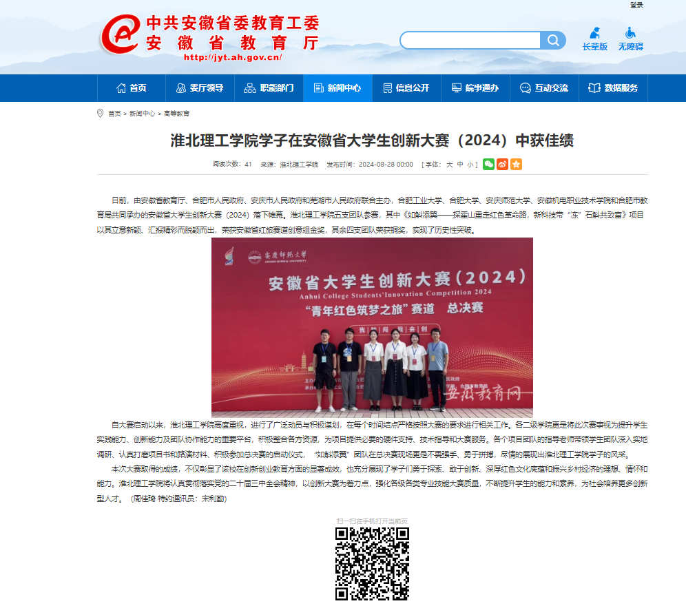 日前,由安徽省教育厅、合肥市人民政府、安庆市人民政府和芜湖市人民政府联合主办,合肥工业大学、合肥大学、安庆师范大学、安徽机电职业技术学院和合肥市教育局共同承办的安徽省大学生创新大赛(2024)落下帷幕。beat365英国官方网站五支团队参赛,其中《如斛添翼——探霍山重走红色革命路,新科技带“冻”石斛共致富》项目以其立意新颖、汇报精彩而脱颖而出,荣获安徽省红旅赛道创意组金奖,其余四支团队荣获铜奖,实现了历史性突破。对此,安徽教育网对此报道: