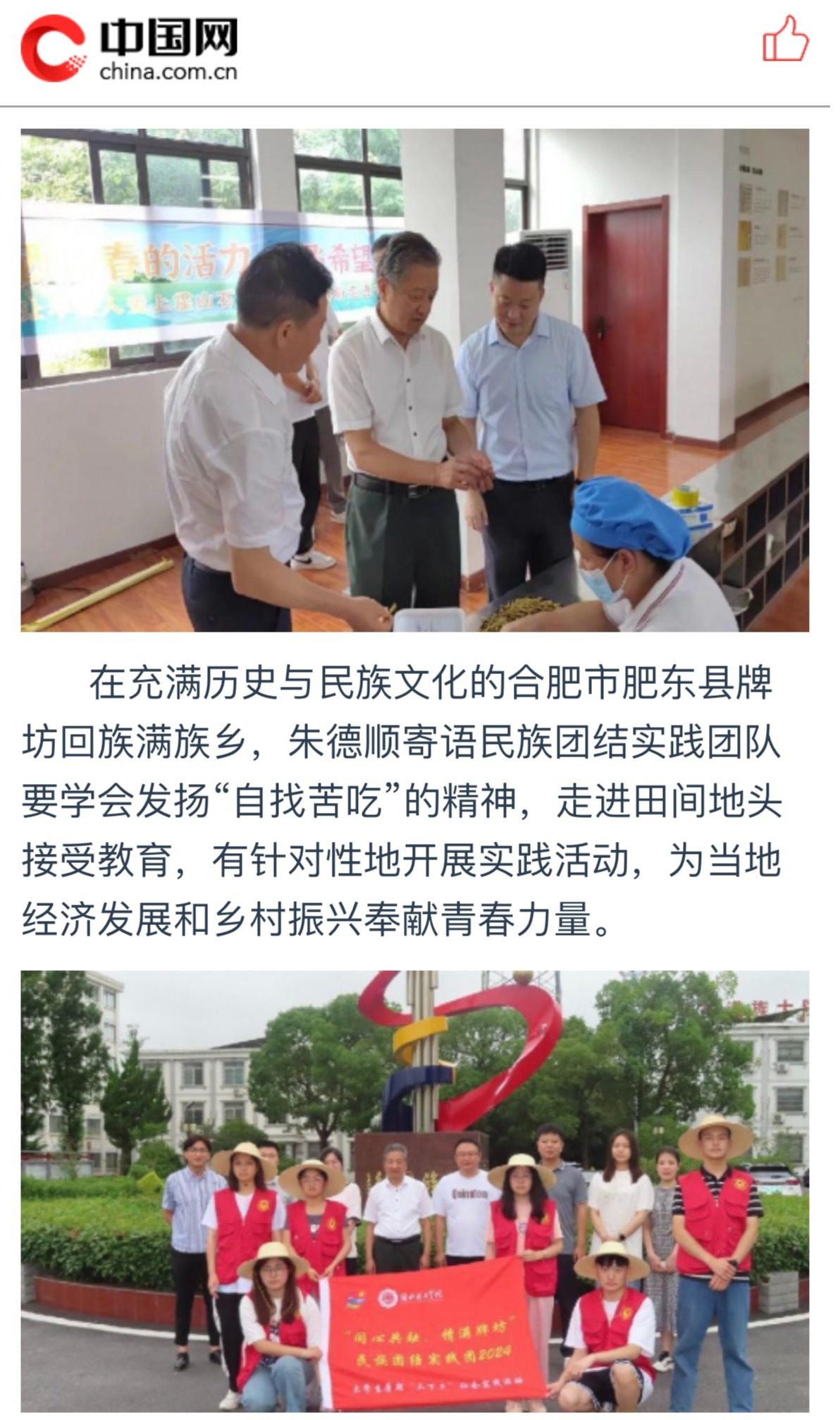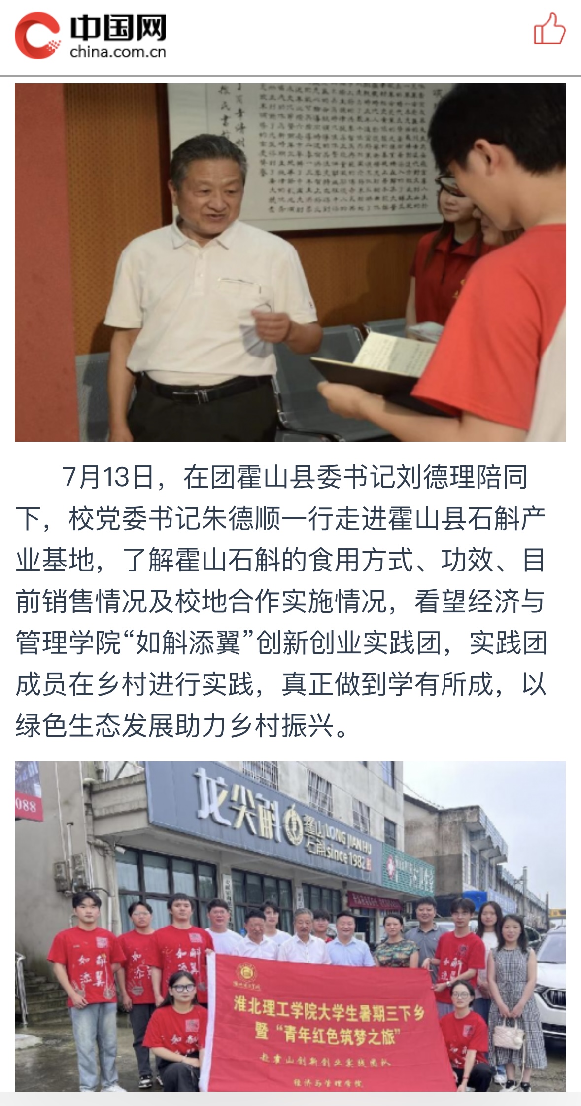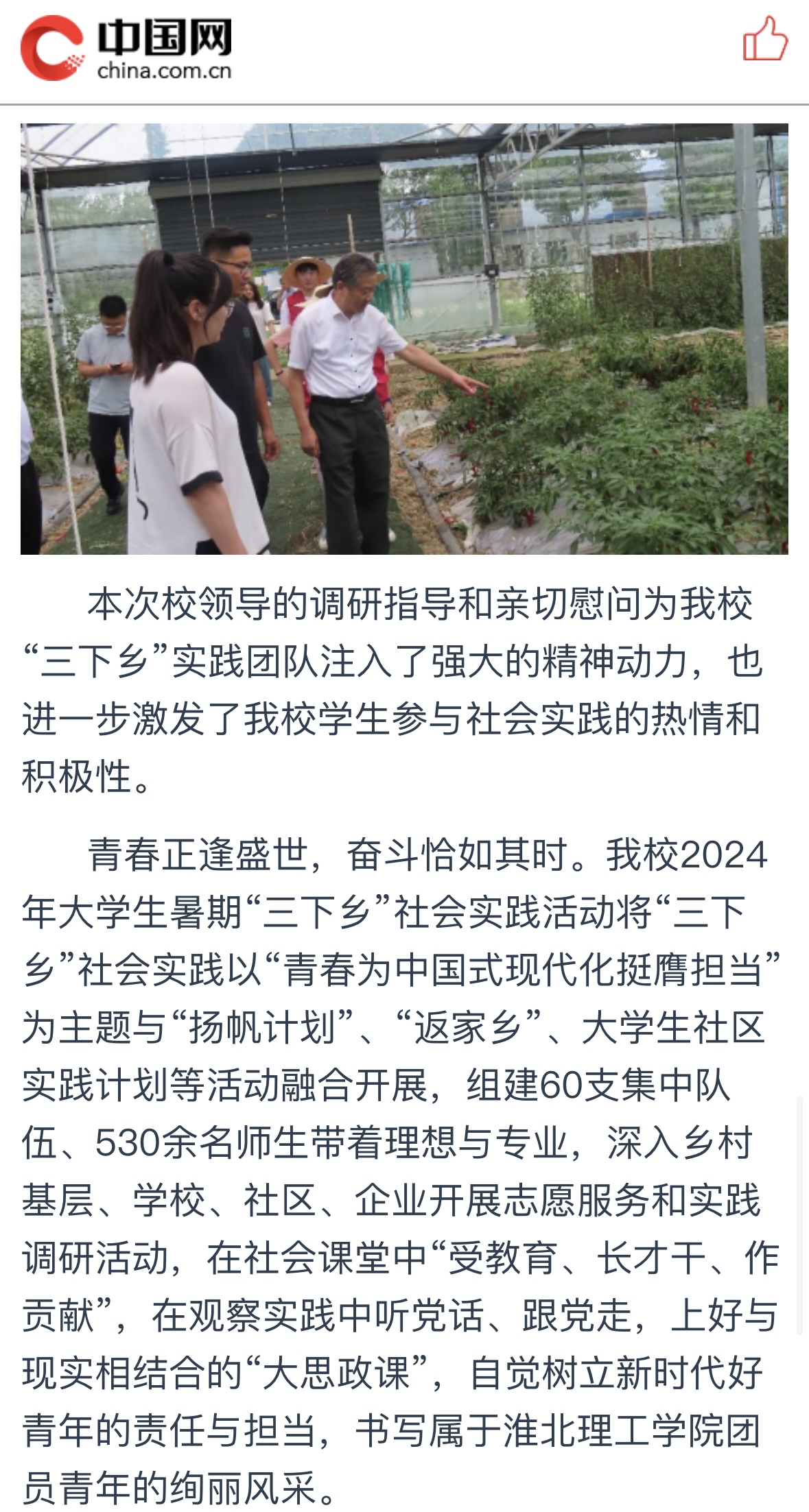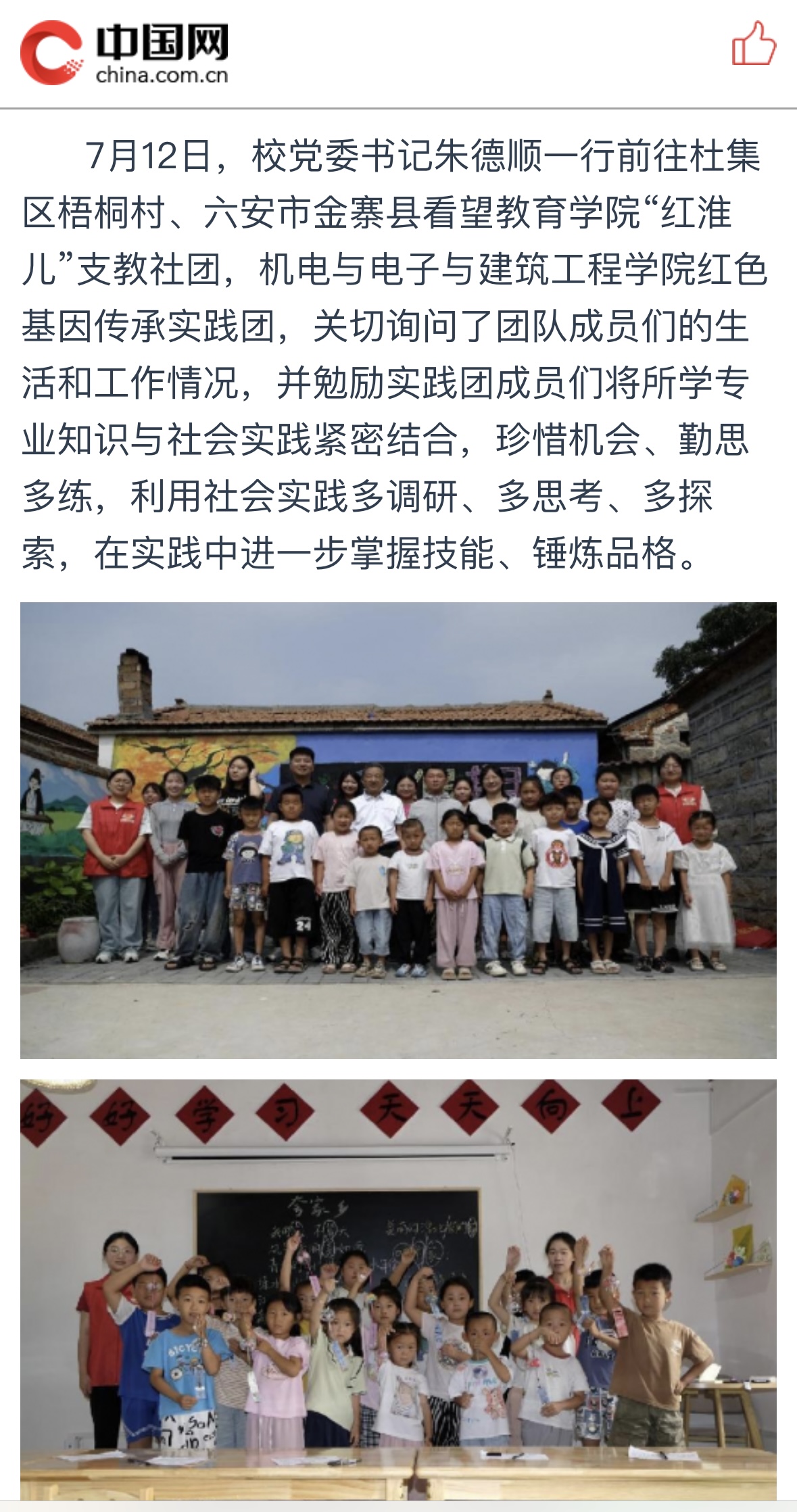 beat365英国官方网站大学生暑期“三下乡”社会实践活动启动以来,学校团员青年在各团队指导教师带领下奔赴祖国各地开展实践服务活动。为了切实了解beat365官网暑期社会实践开展情况,7月9日至13日,校党委书记朱德顺、副校长郑来纪分别前往淮北市、六安市、合肥市等地,看望慰问社会实践团队师生,调研指导实践工作,进一步推进校地合作。学生处、校团委相关职能部门负责人陪同慰问。对此,中国网进行了报道: