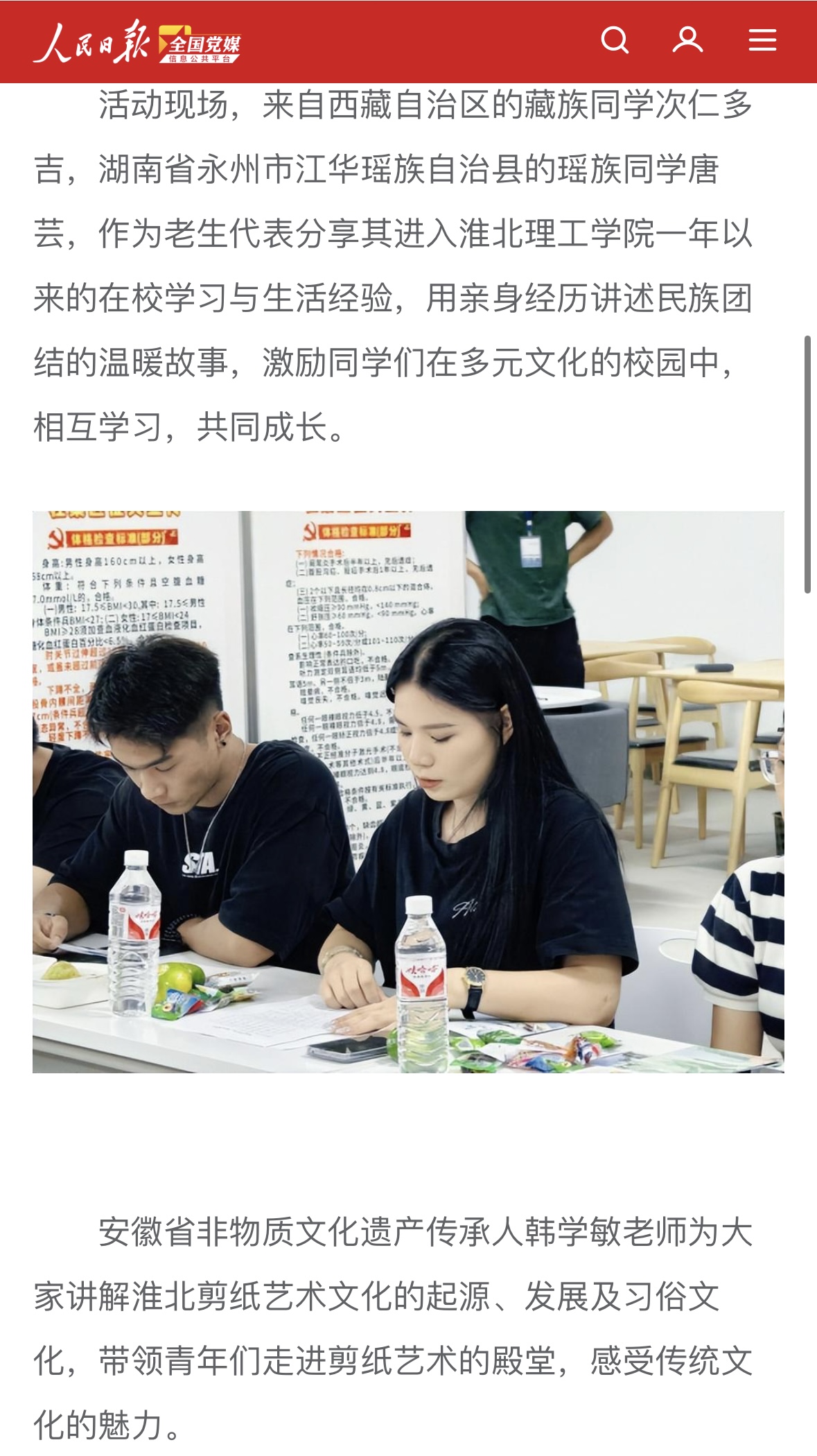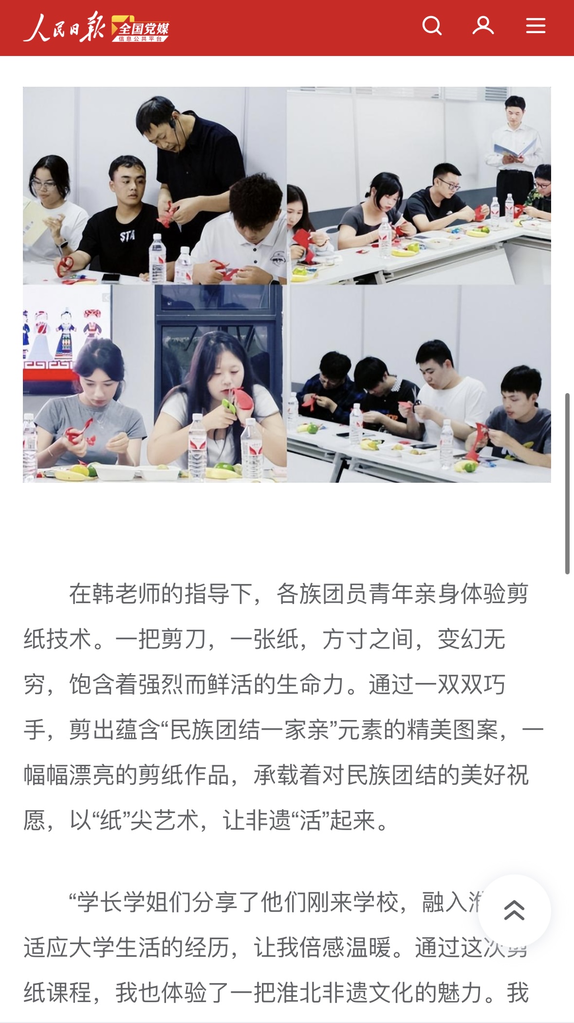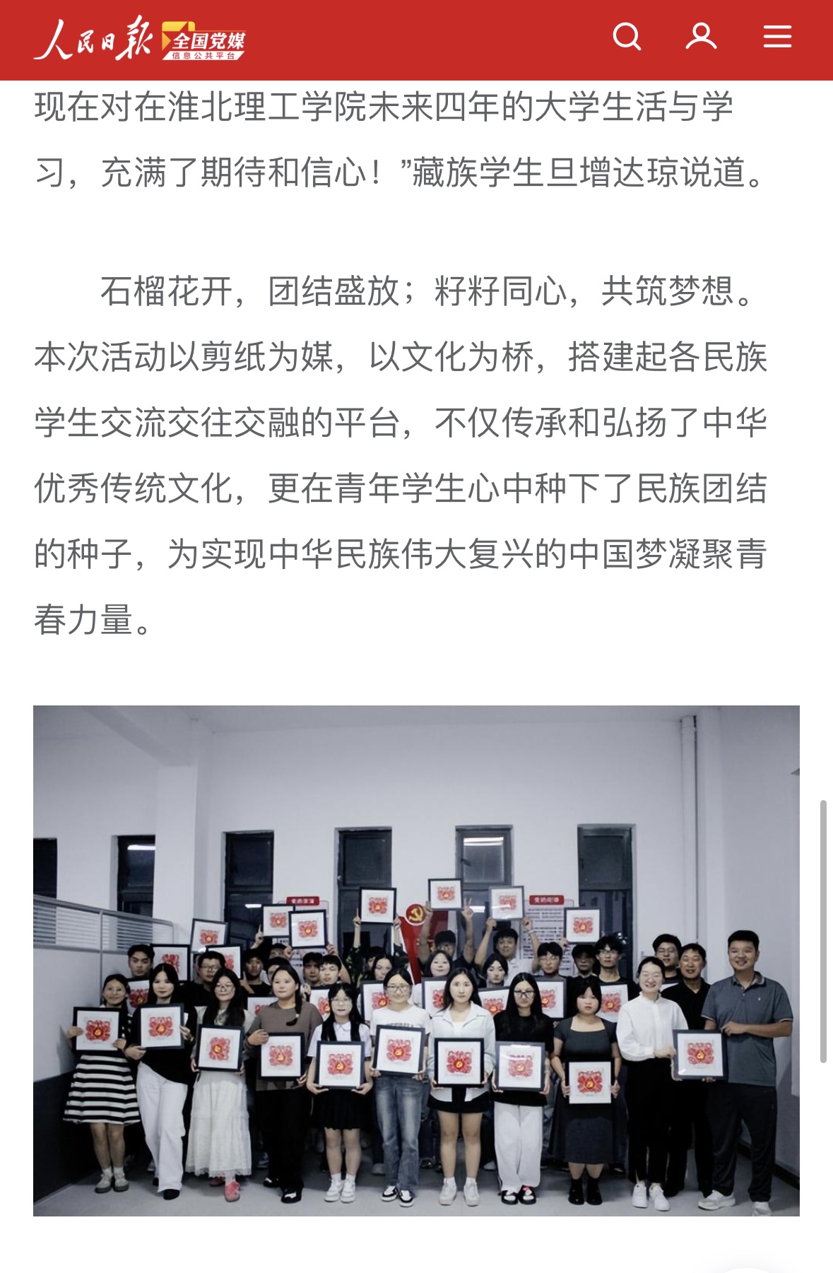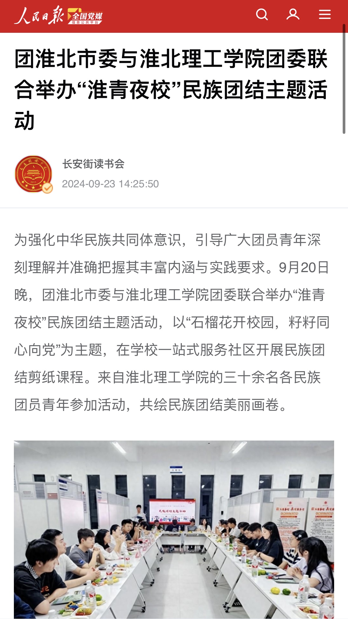 为强化中华民族共同体意识,引导广大团员青年深刻理解并准确把握其丰富内涵与实践要求。9月20日晚,团淮北市委与beat365英国官方网站团委联合举办“淮青夜校”民族团结主题活动,以“石榴花开校园,籽籽同心向党”为主题,在学校一站式服务社区开展民族团结剪纸课程。来自beat365英国官方网站的三十余名各民族团员青年参加活动,共绘民族团结美丽画卷。对此,人民日报全国党媒信息公共平台进行报道: