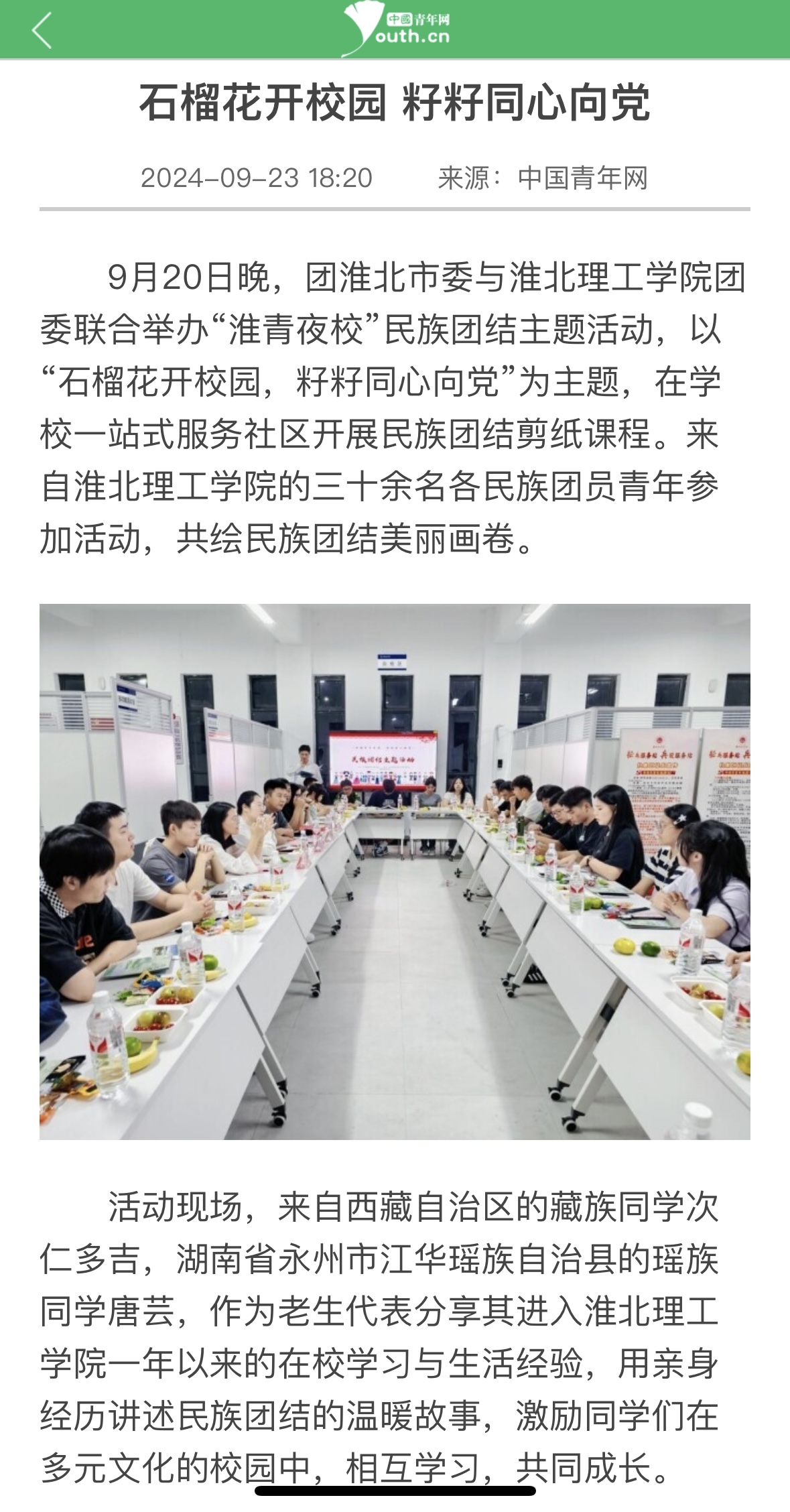 9月20日晚,团淮北市委与beat365英国官方网站团委联合举办“淮青夜校”民族团结主题活动,以“石榴花开校园,籽籽同心向党”为主题,在学校一站式服务社区开展民族团结剪纸课程。来自beat365英国官方网站的三十余名各民族团员青年参加活动,共绘民族团结美丽画卷。对此,中国青年网进行报道:
