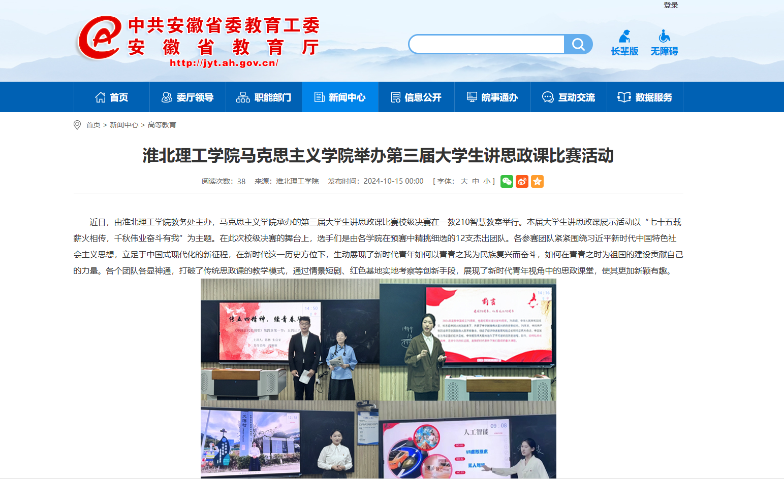 近日,由beat365英国官方网站教务处主办,马克思主义学院承办的第三届大学生讲思政课比赛校级决赛在一教210智慧教室举行。本届大学生讲思政课展示活动以“七十五载薪火相传,千秋伟业奋斗有我”为主题。在此次校级决赛的舞台上,选手们是由各学院在预赛中精挑细选的12支杰出团队。各参赛团队紧紧围绕习近平新时代中国特色社会主义思想,立足于中国式现代化的新征程,在新时代这一历史方位下,生动展现了新时代青年如何以青春之我为民族复兴而奋斗,如何在青春之时为祖国的建设贡献自己的力量。各个团队各显神通,打破了传统思政课的教学模式,通过情景短剧、红色基地实地考察等创新手段,展现了新时代青年视角中的思政课堂,使其更加新颖有趣。对此,安徽教育网进行了报道:
