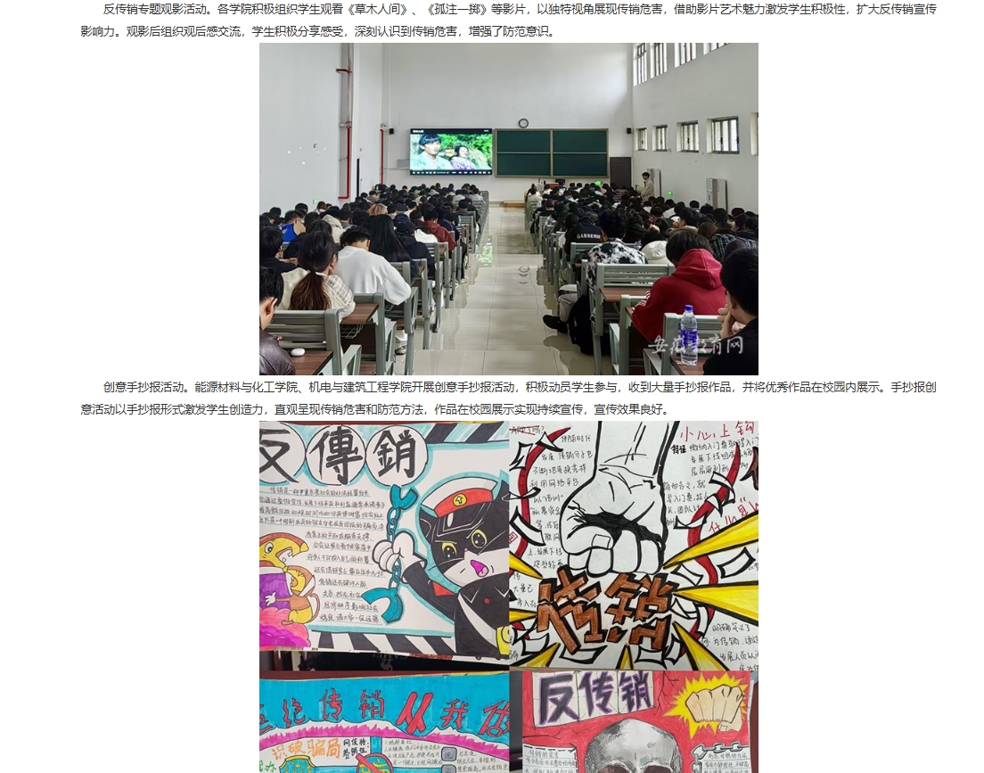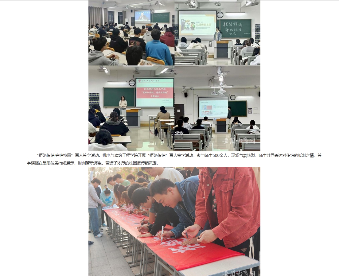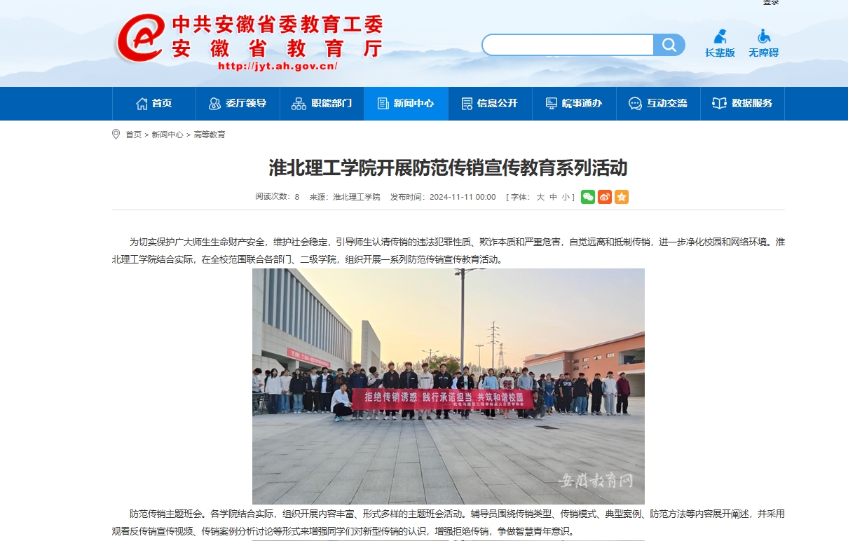 为切实保护广大师生生命财产安全,维护社会稳定,引导师生认清传销的违法犯罪性质、欺诈本质和严重危害,自觉远离和抵制传销,进一步净化校园和网络环境。beat365英国官方网站结合实际,在全校范围联合各部门、二级学院,组织开展一系列防范传销宣传教育活动。对此,安徽教育网进行了报道:
