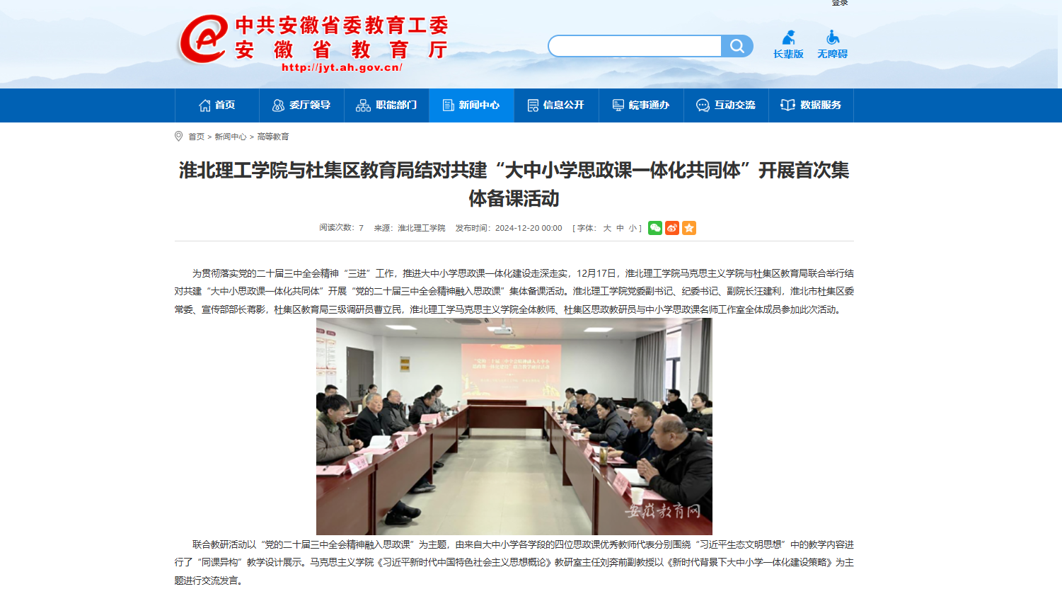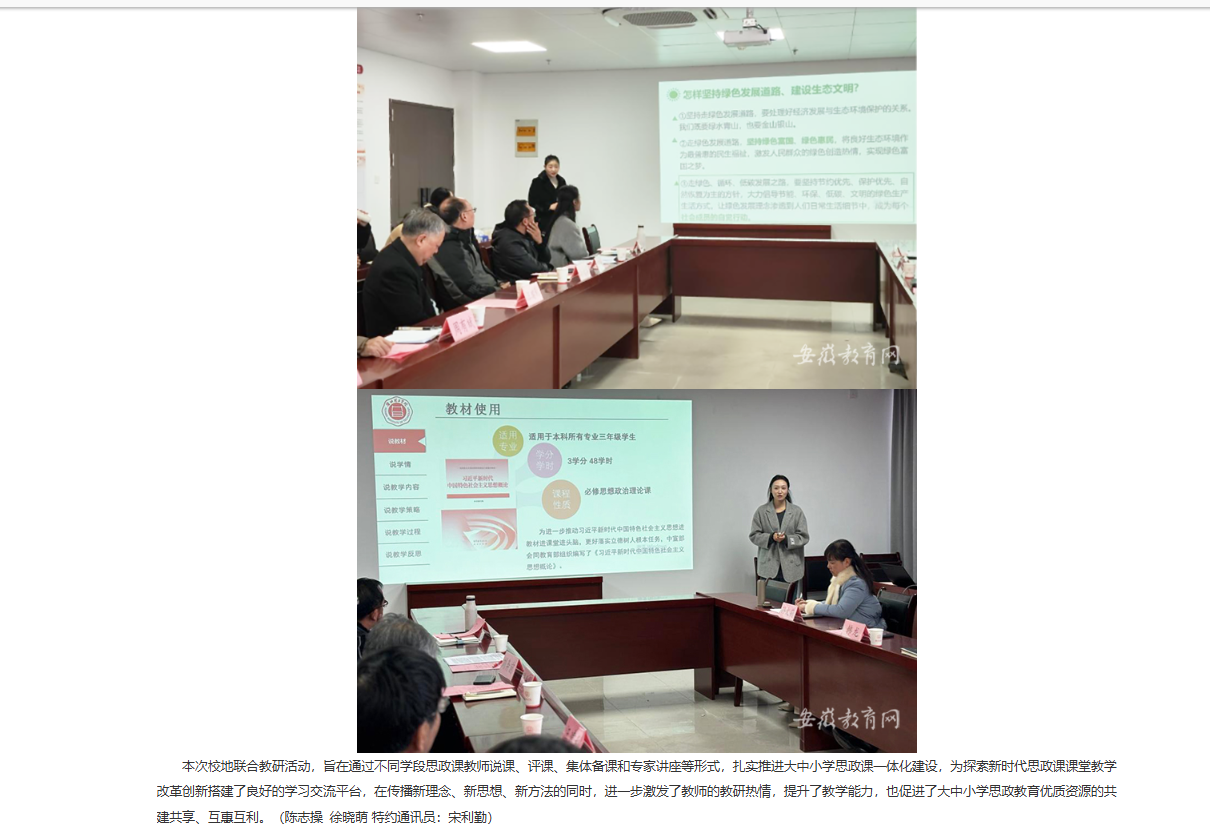 为贯彻落实党的二十届三中全会精神“三进”工作,推进大中小学思政课一体化建设走深走实,12月17日,beat365英国官方网站马克思主义学院与杜集区教育局联合举行结对共建“大中小思政课一体化共同体”开展“党的二十届三中全会精神融入思政课”集体备课活动。beat365英国官方网站党委副书记、纪委书记、副院长汪建利,淮北市杜集区委常委、宣传部部长蒋影,杜集区教育局三级调研员曹立民,淮北理工学马克思主义学院全体教师、杜集区思政教研员与中小学思政课名师工作室全体成员参加此次活动。对此,安徽教育网进行了报道: