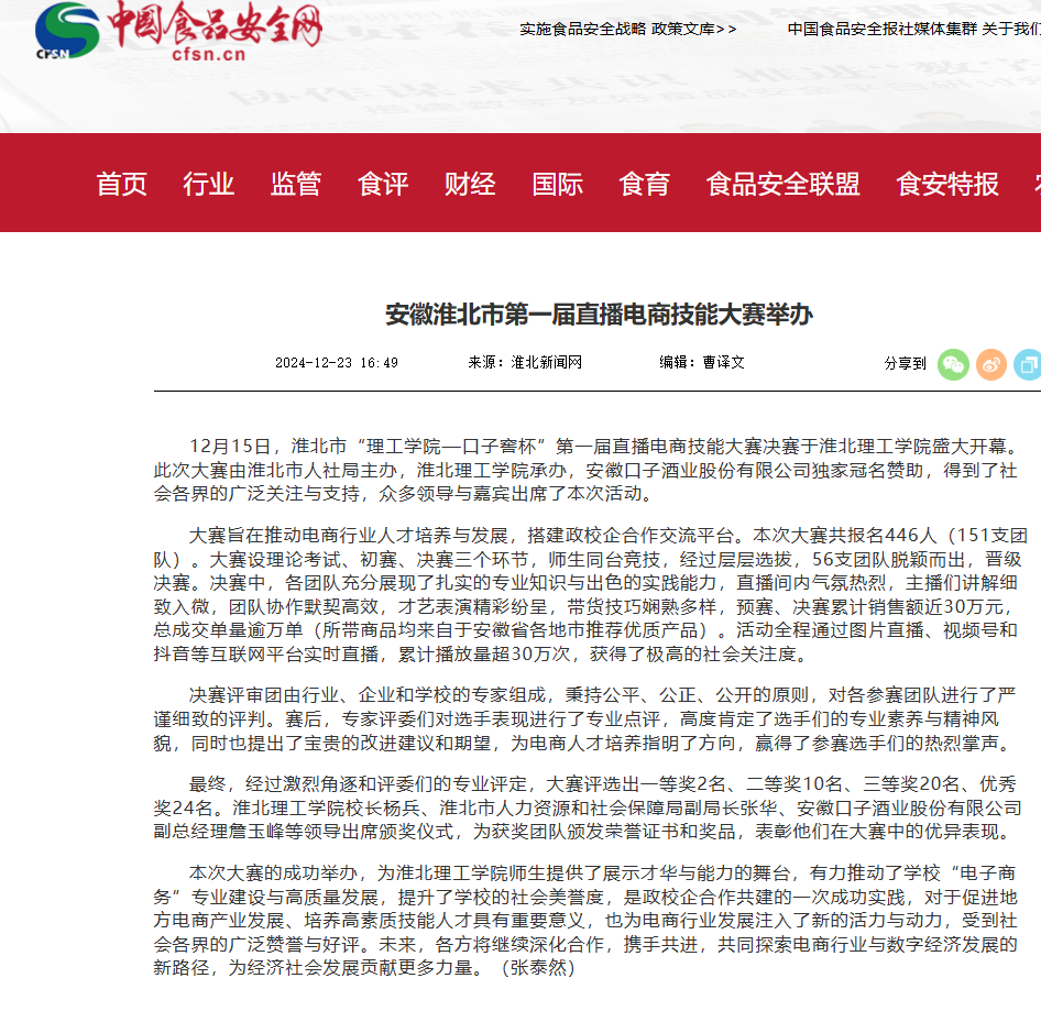 12月15日,淮北市“理工学院—口子窖杯”第一届直播电商技能大赛决赛于beat365英国官方网站盛大开幕。此次大赛由淮北市人社局主办,beat365英国官方网站承办,安徽口子酒业股份有限公司独家冠名赞助,得到了社会各界的广泛关注与支持,众多领导与嘉宾出席了本次活动。对此,中国食品安全网进行了报道: