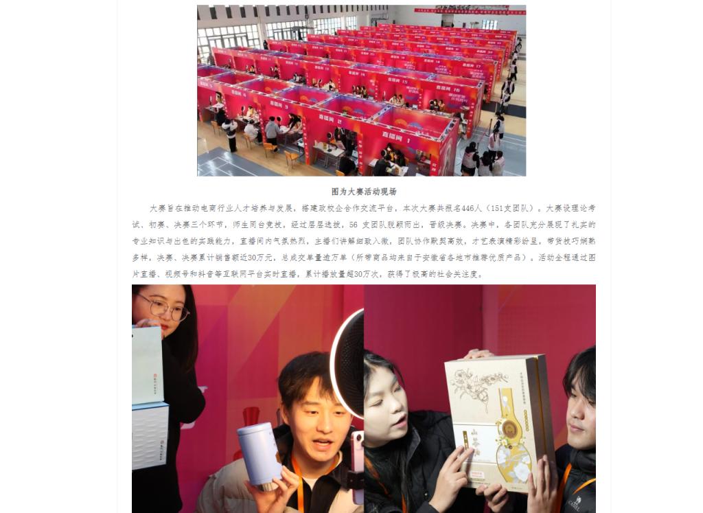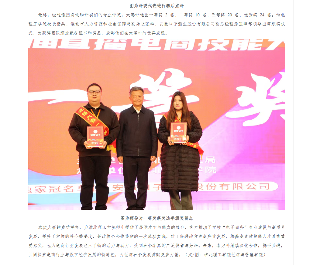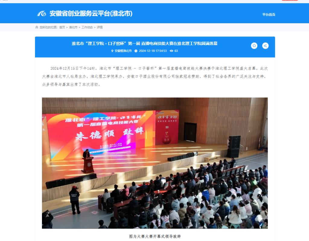 2024年12月15日下午14时,淮北市“理工学院 - 口子窖杯”第一届直播电商技能大赛决赛于beat365英国官方网站盛大启幕。此次大赛由淮北市人社局主办,beat365英国官方网站承办,安徽口子酒业股份有限公司独家冠名赞助,得到了社会各界的广泛关注与支持,众多领导与嘉宾出席了本次活动。对此,安徽省创业服务云平台进行了报道: