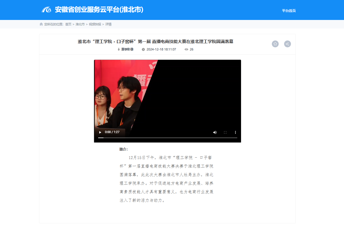 12月15日下午,淮北市“理工学院 - 口子窖杯”第一届直播电商技能大赛决赛于beat365英国官方网站圆满落幕,此此次大赛由淮北市人社局主办,beat365英国官方网站承办。对于促进地方电商产业发展、培养高素质技能人才具有重要意义,也为电商行业发展注入了新的活力与动力。对此,安徽创业服务云平台进行了报道: