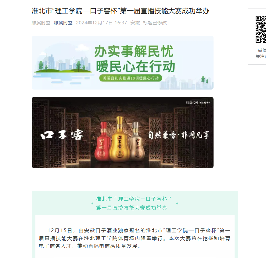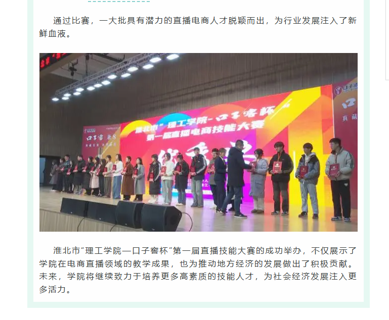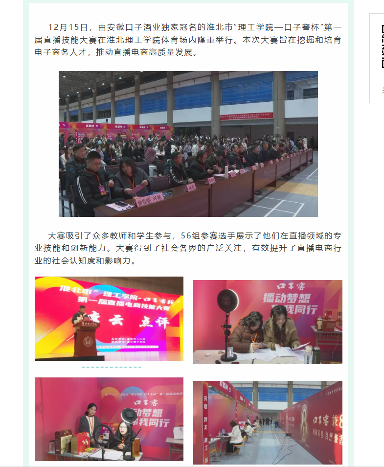 12月15日,由安徽口子酒业独家冠名的淮北市“理工学院—口子窖杯”第一届直播技能大赛在beat365英国官方网站体育场内隆重举行。本次大赛旨在挖掘和培育电子商务人才,推动直播电商高质量发展。对此,濉溪时空进行了报道: