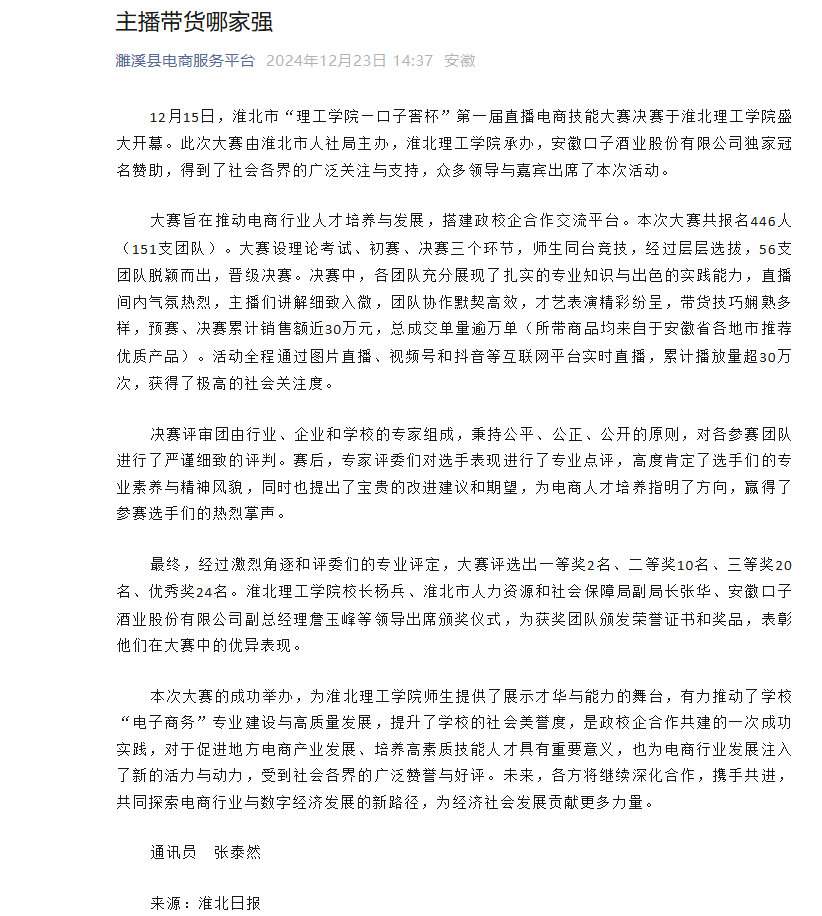 12月15日,淮北市“理工学院—口子窖杯”第一届直播电商技能大赛决赛于beat365英国官方网站盛大开幕。此次大赛由淮北市人社局主办,beat365英国官方网站承办,安徽口子酒业股份有限公司独家冠名赞助,得到了社会各界的广泛关注与支持,众多领导与嘉宾出席了本次活动。对此,濉溪县电商服务平台进行了报道:
