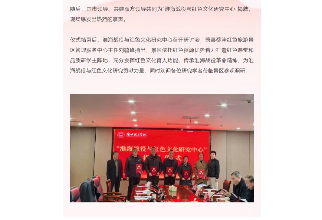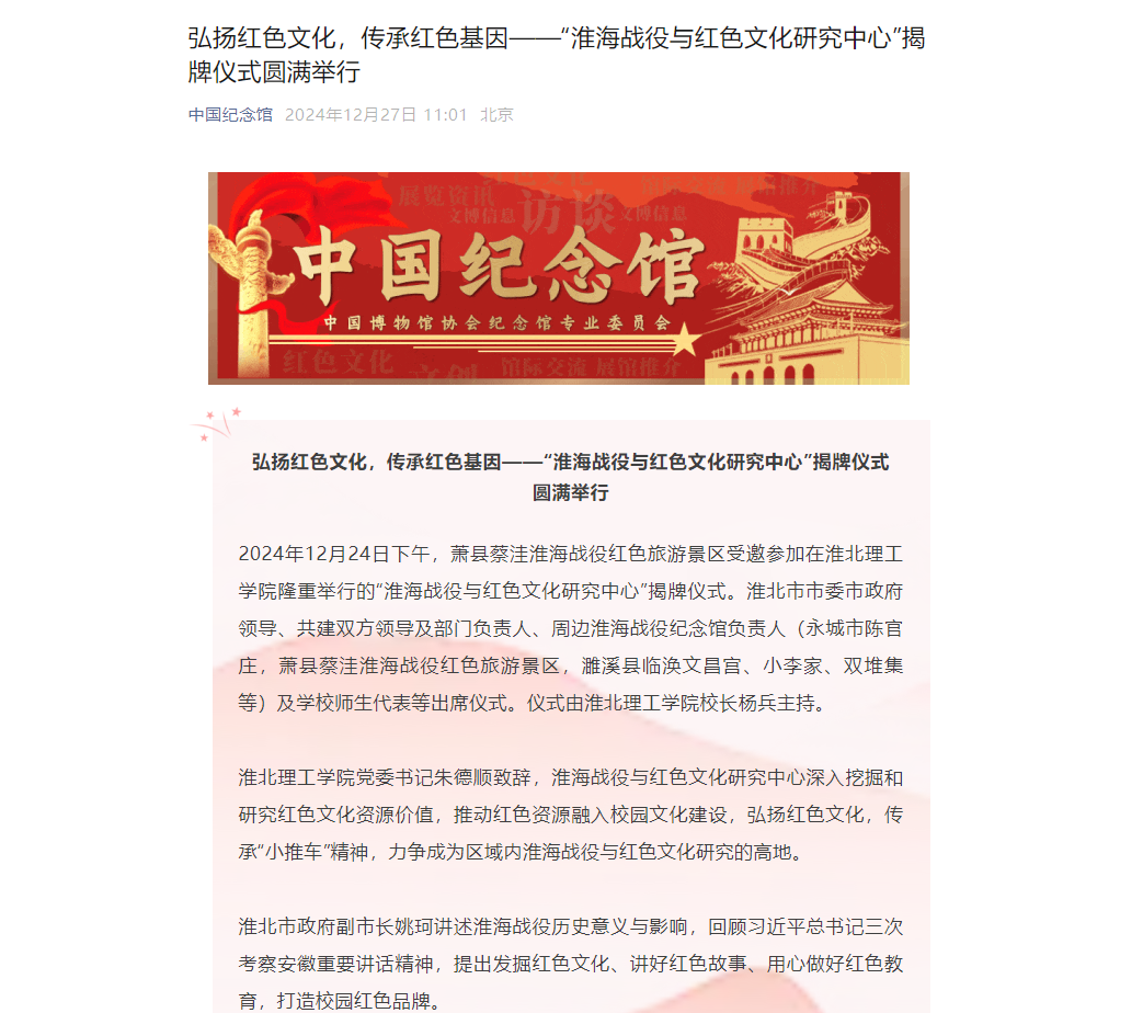 2024年12月24日下午,萧县蔡洼淮海战役红色旅游景区受邀参加在beat365英国官方网站隆重举行的“淮海战役与红色文化研究中心”揭牌仪式。淮北市市委市政府领导、共建双方领导及部门负责人、周边淮海战役纪念馆负责人(永城市陈官庄,萧县蔡洼淮海战役红色旅游景区,濉溪县临涣文昌宫、小李家、双堆集等)及学校师生代表等出席仪式。仪式由beat365英国官方网站校长杨兵主持。对此,中国纪念馆进行了报道: