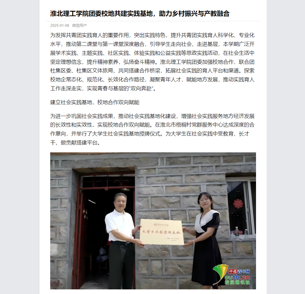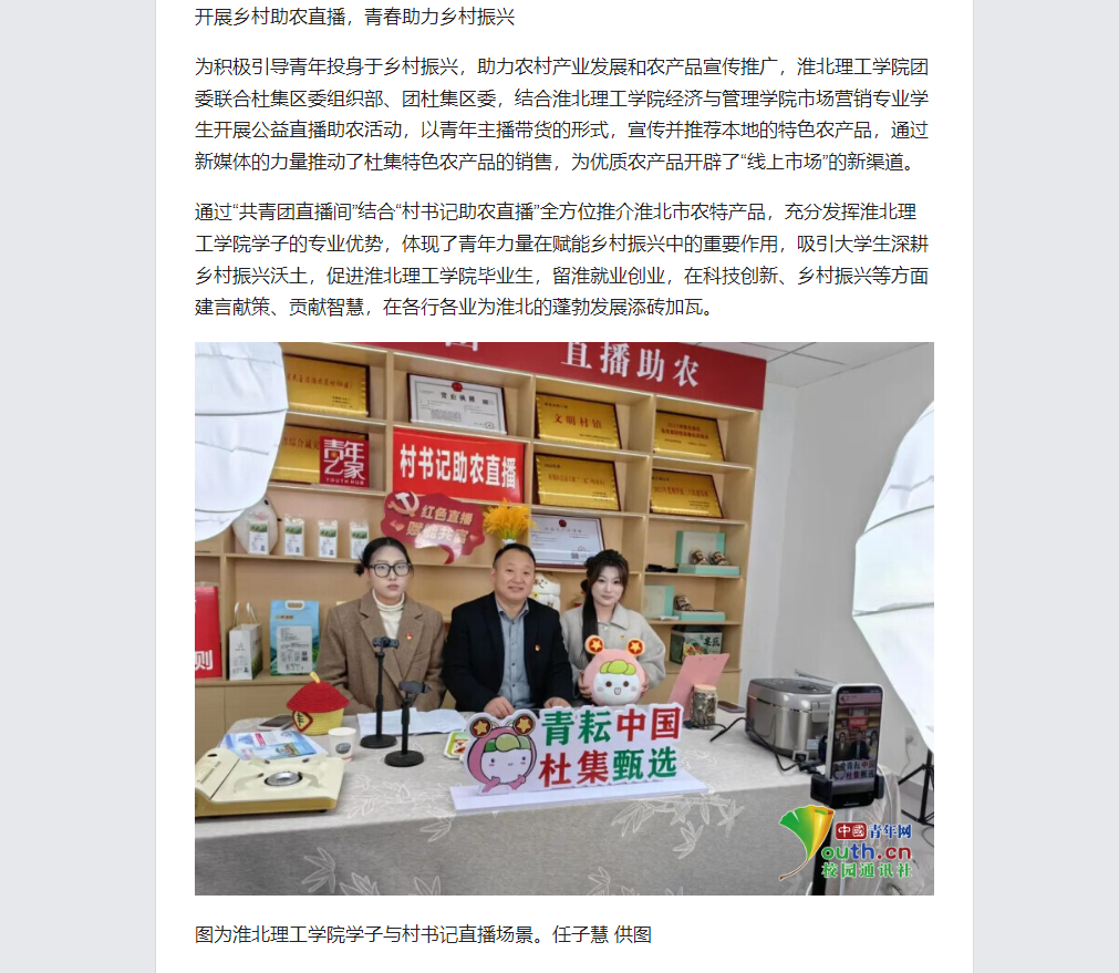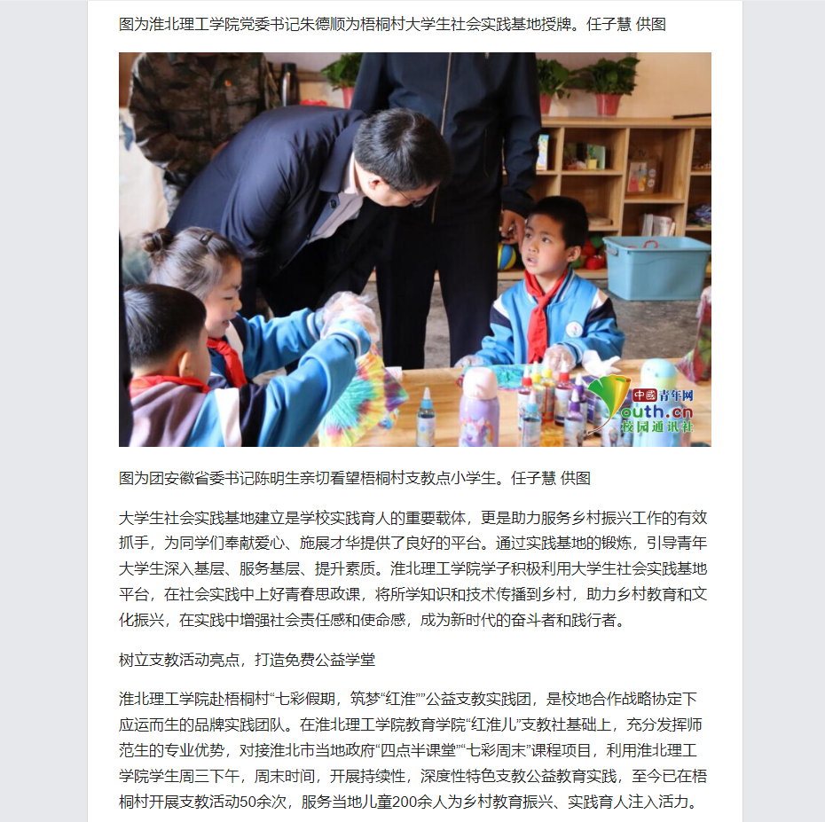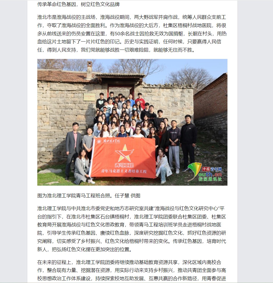 为发挥共青团实践育人的重要作用,突出实践特色,提升共青团实践育人科学化、专业化水平,推动第二课堂与第一课堂深度融合,引导学生走向社会、走进基层,本学期广泛开展学术实践、主题实践、社区实践、体验实践和公益实践等思政实践活动,在社会生活中坚定理想信念,提升精神素养,弘扬奋斗精神。beat365英国官方网站团委加强校地合作,联合团杜集区委、杜集区文体旅局、共同搭建合作桥梁,拓展社会实践的育人平台和渠道。探索校地企常态化、规范化、长效化合作路径,凝聚青年人才,赋能地方发展,推动实践育人工作走深走实,实现青春与基层的“双向奔赴”。对此,中国青年网进行了报道: