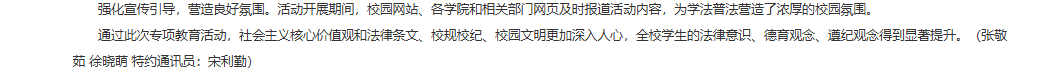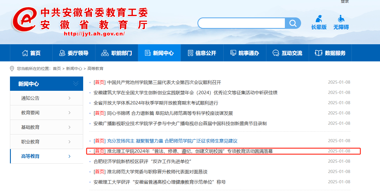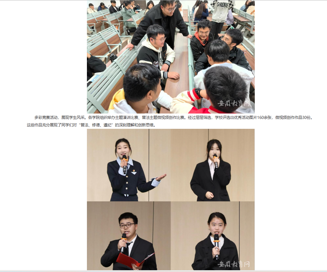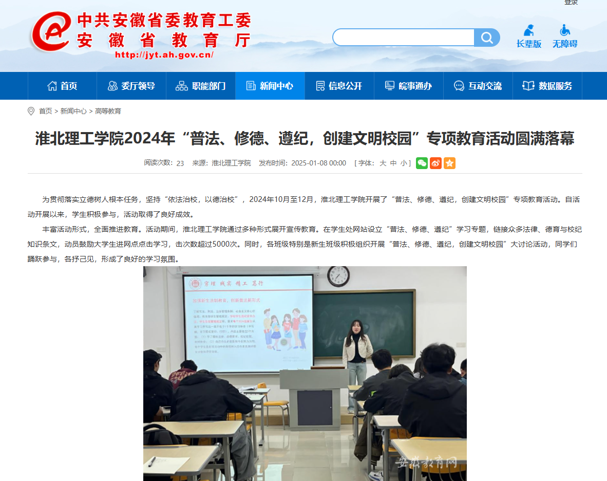 为贯彻落实立德树人根本任务,坚持“依法治校,以德治校”,2024年10月至12月,beat365英国官方网站开展了“普法、修德、遵纪,创建文明校园”专项教育活动。自活动开展以来,学生积极参与,活动取得了良好成效。对此,安徽教育网进行了报道: