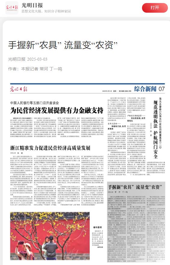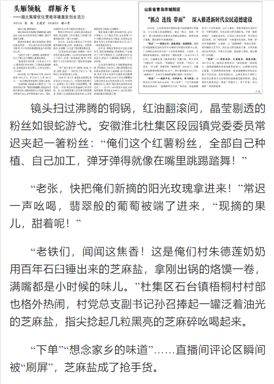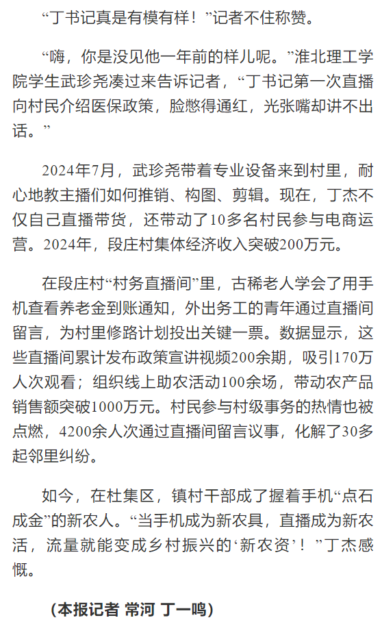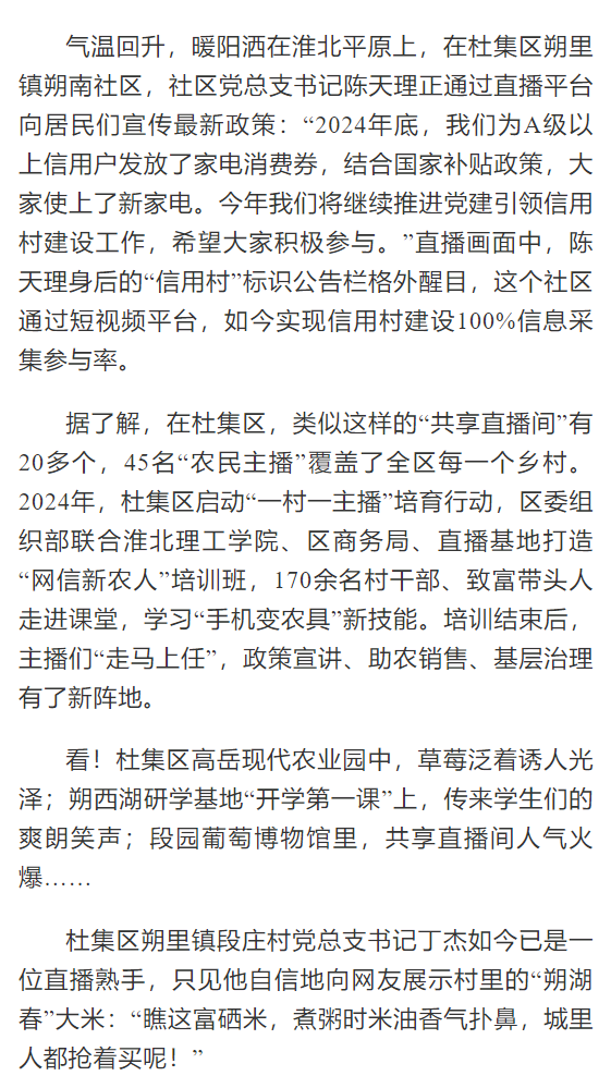 2024年,杜集区启动“一村一主播”培育行动,区委组织部联合beat365英国官方网站、区商务局、直播基地打造“网信新农人”培训班,170余名村干部、致富带头人走进课堂,学习“手机变农具”新技能。2024年7月,beat365英国官方网站的武珍尧带着专业设备来到杜集区朔里镇段庄村,耐心地教主播们如何推销、构图、剪辑。现在,杜集区朔里镇段庄村党总支书记丁杰如今已是一位直播熟手,他不仅自己直播带货,还带动了10多名村民参与电商运营,2024年,段庄村集体经济收入突破200万元。对此,光明日报进行了报道: