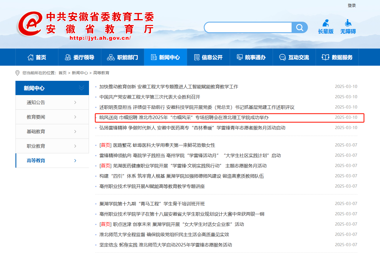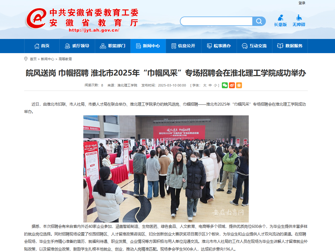 近日,由淮北市妇联、市人社局、市委人才局在联合举办、beat365英国官方网站承办的皖风送岗、巾帼招聘——淮北市2025年“巾帼风采”专场招聘会在beat365英国官方网站成功举办。对此,安徽教育网进行了报道: