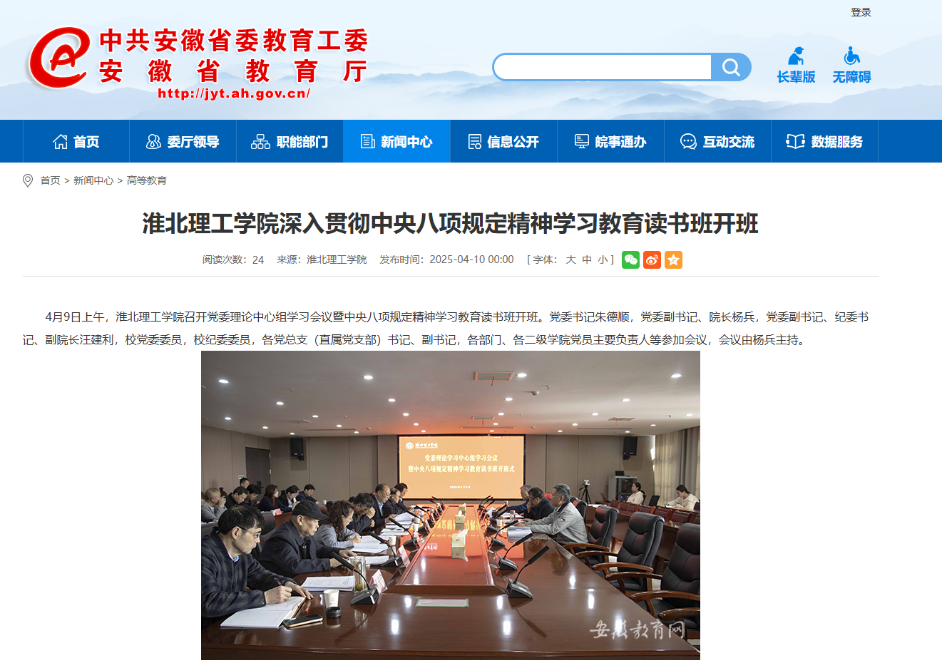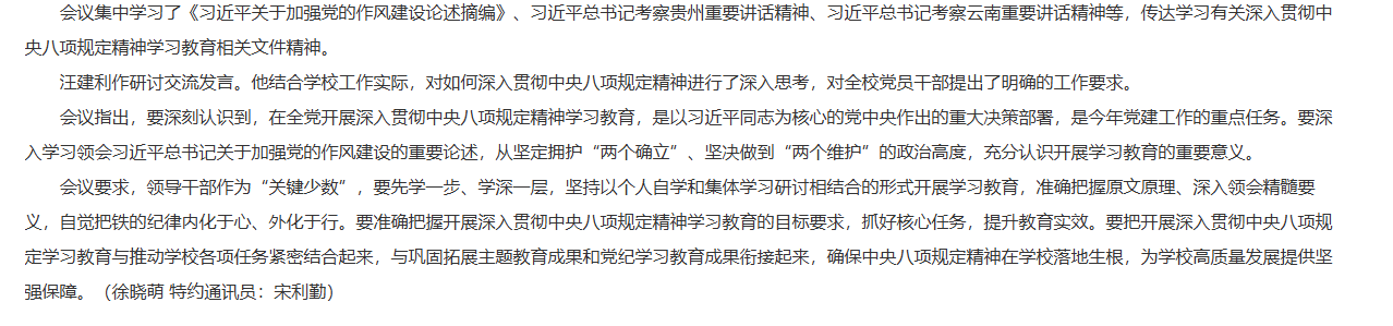 4月9日上午,beat365英国官方网站召开党委理论中心组学习会议暨中央八项规定精神学习教育读书班开班。党委书记朱德顺,党委副书记、院长杨兵,党委副书记、纪委书记、副院长汪建利,校党委委员,校纪委委员,各党总支(直属党支部)书记、副书记,各部门、各二级学院党员主要负责人等参加会议,会议由杨兵主持。对此,安徽教育网进行了报道: