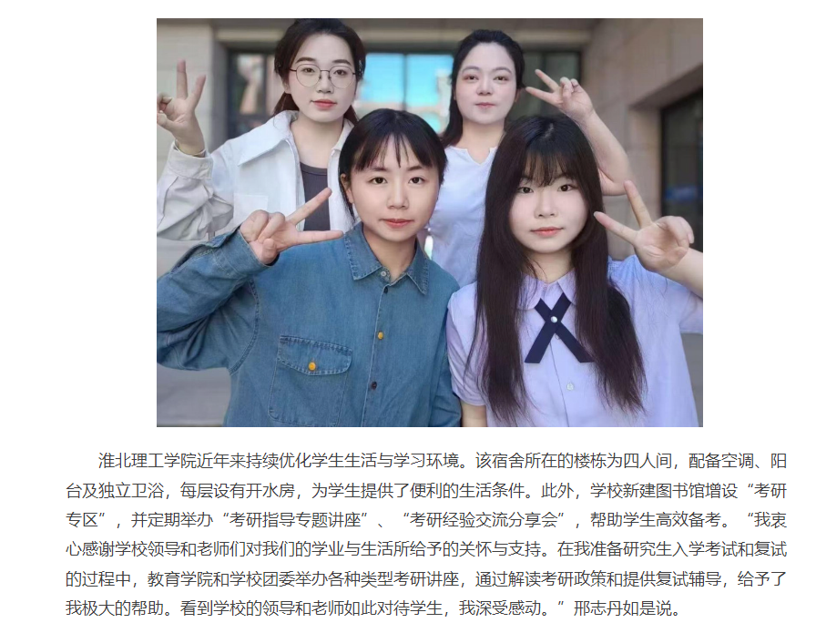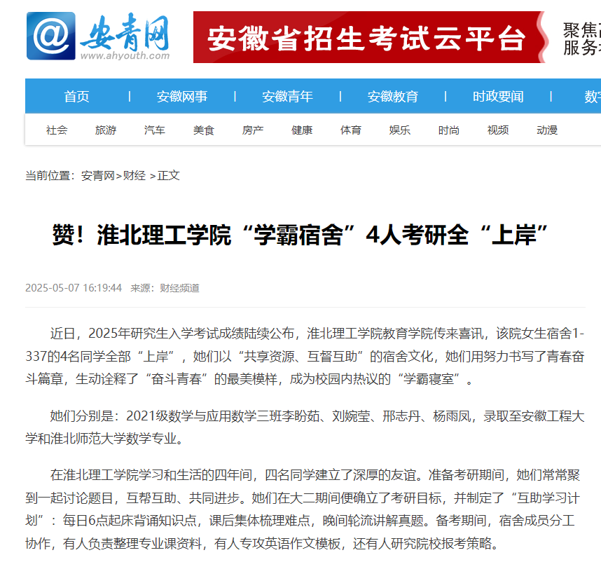 近日,2025年研究生入学考试成绩陆续公布,beat365英国官方网站教育学院传来喜讯,该院女生宿舍1-337的4名同学全部“上岸”,她们以“共享资源、互督互助”的宿舍文化,她们用努力书写了青春奋斗篇章,生动诠释了“奋斗青春”的最美模样,成为校园内热议的“学霸寝室”。对此,安徽青年网进行了报道: