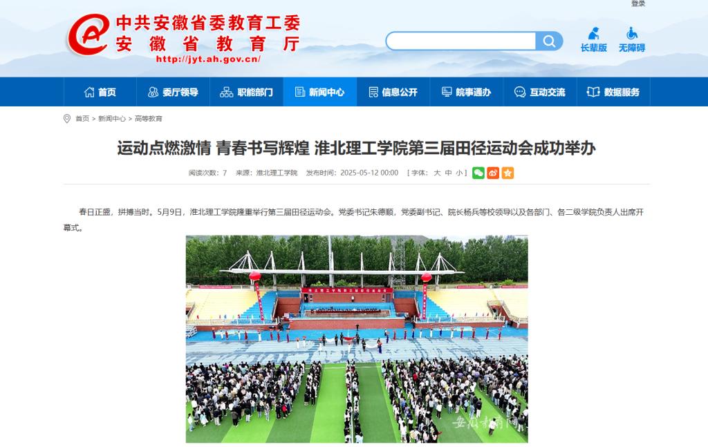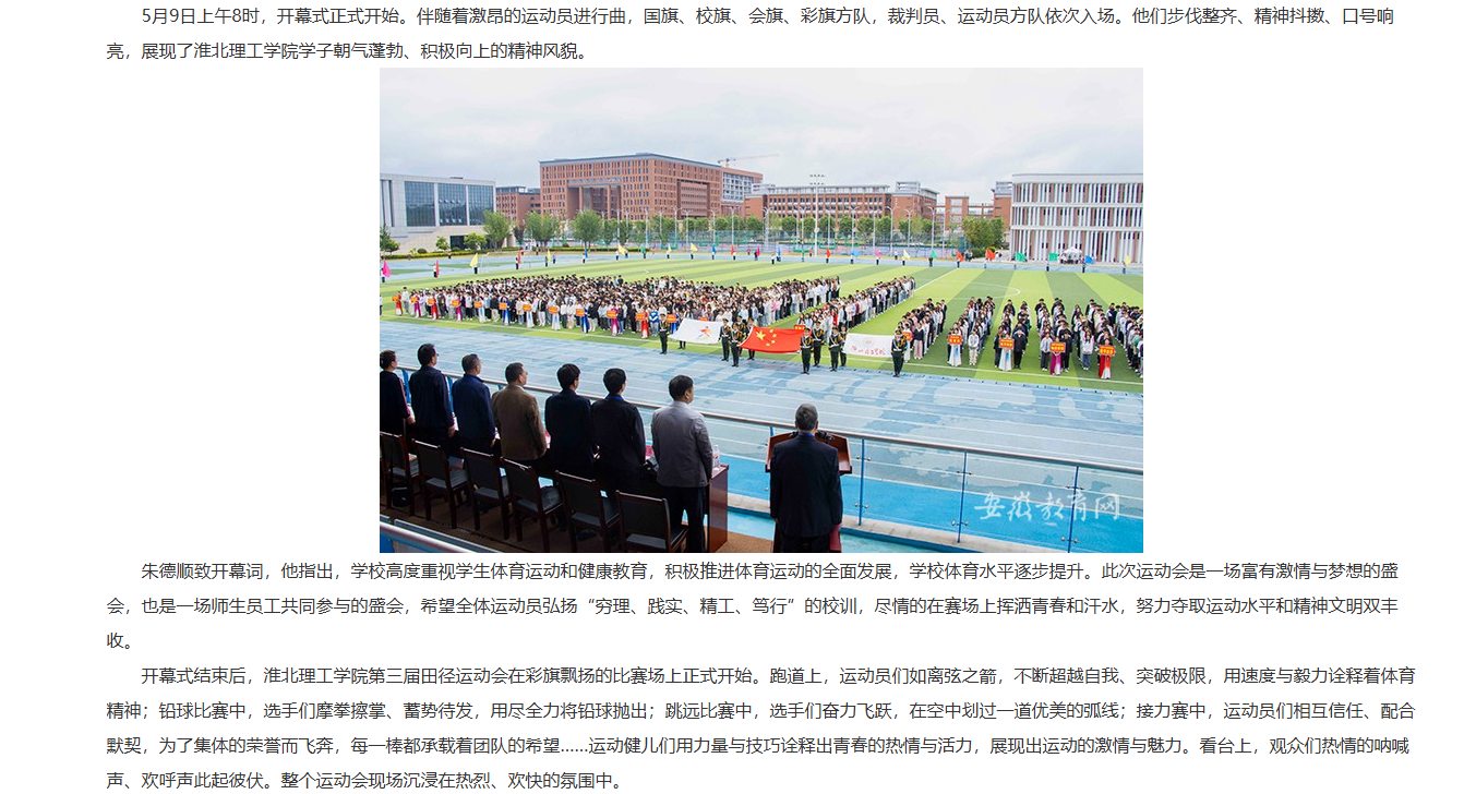 春日正盛,拼搏当时。5月9日,beat365英国官方网站隆重举行第三届田径运动会。党委书记朱德顺,党委副书记、院长杨兵等校领导以及各部门、各二级学院负责人出席开幕式。对此,安徽教育网进行了报道:
