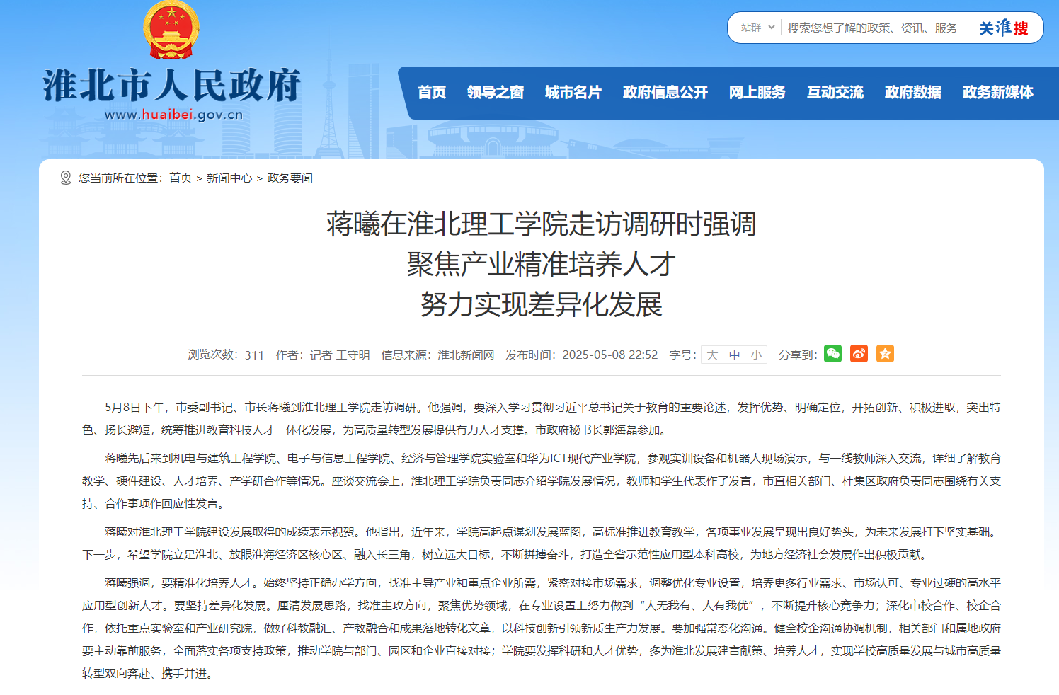 5月8日下午,市委副书记、市长蒋曦到beat365英国官方网站走访调研。他强调,要深入学习贯彻习近平总书记关于教育的重要论述,发挥优势、明确定位,开拓创新、积极进取,突出特色、扬长避短,统筹推进教育科技人才一体化发展,为高质量转型发展提供有力人才支撑。市政府秘书长郭海磊参加。对此,淮北市人民政府进行了报道: