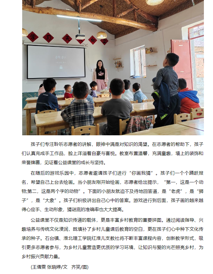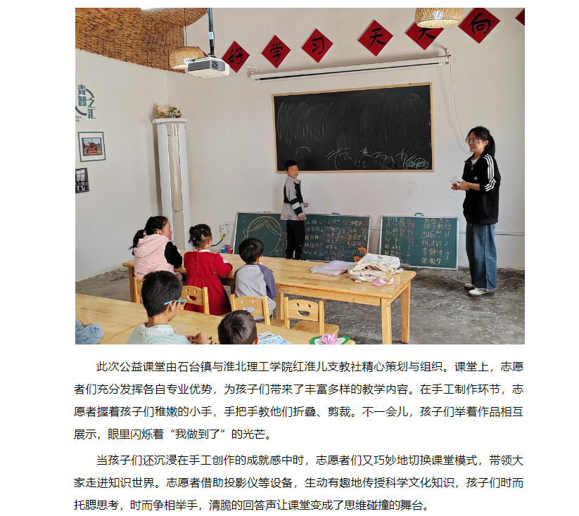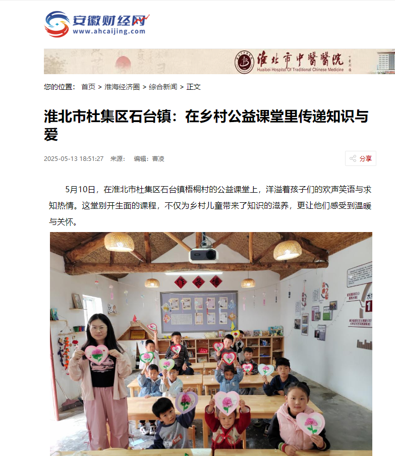 5月10日,在淮北市杜集区石台镇梧桐村的公益课堂上,洋溢着孩子们的欢声笑语与求知热情。这堂别开生面的课程,不仅为乡村儿童带来了知识的滋养,更让他们感受到温暖与关怀。对此,安徽财经网进行了报道:
