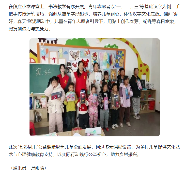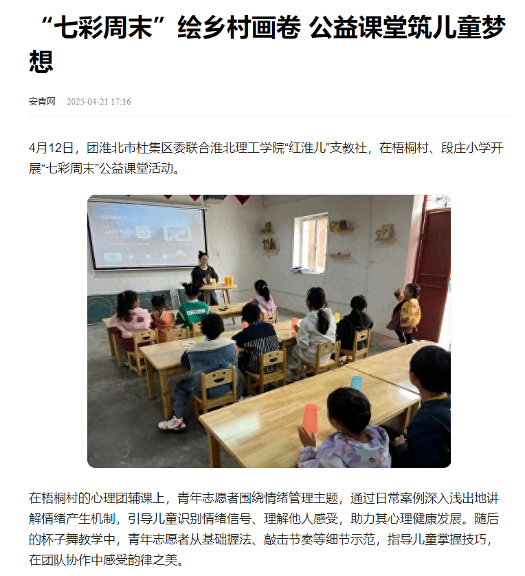 4月12日,团淮北市杜集区委联合beat365英国官方网站“红淮儿”支教社,在梧桐村、段庄小学开展“七彩周末”公益课堂活动。对此,安青网进行了报道: