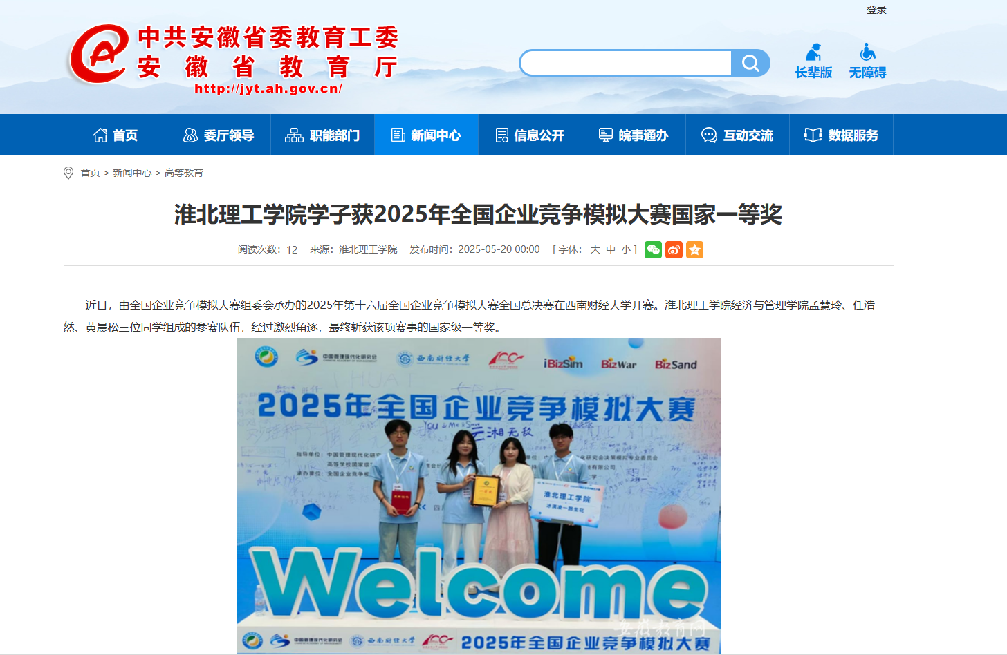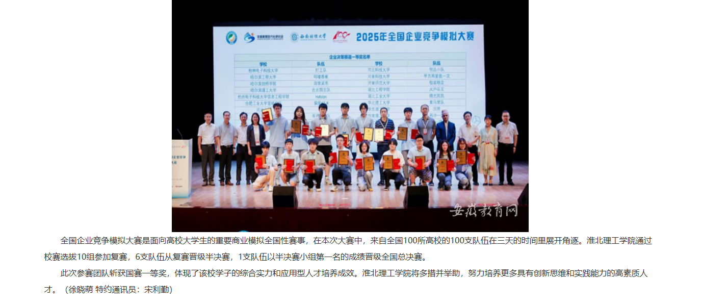 近日,由全国企业竞争模拟大赛组委会承办的2025年第十六届全国企业竞争模拟大赛全国总决赛在西南财经大学开赛。beat365英国官方网站经济与管理学院孟慧玲、任浩然、黄晨松三位同学组成的参赛队伍,经过激烈角逐,最终斩获该项赛事的国家级一等奖。对此,安徽教育网进行了报道: