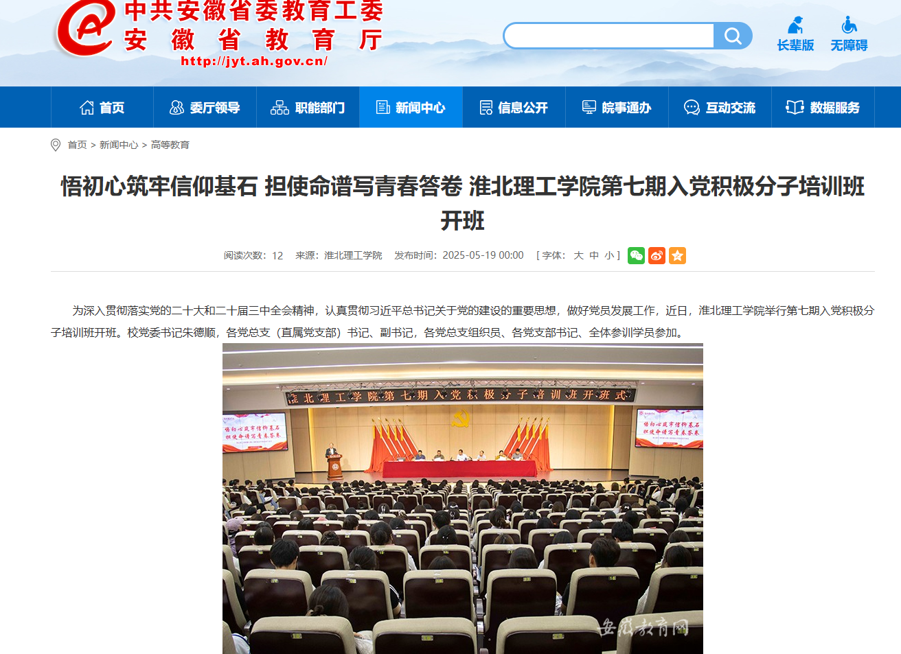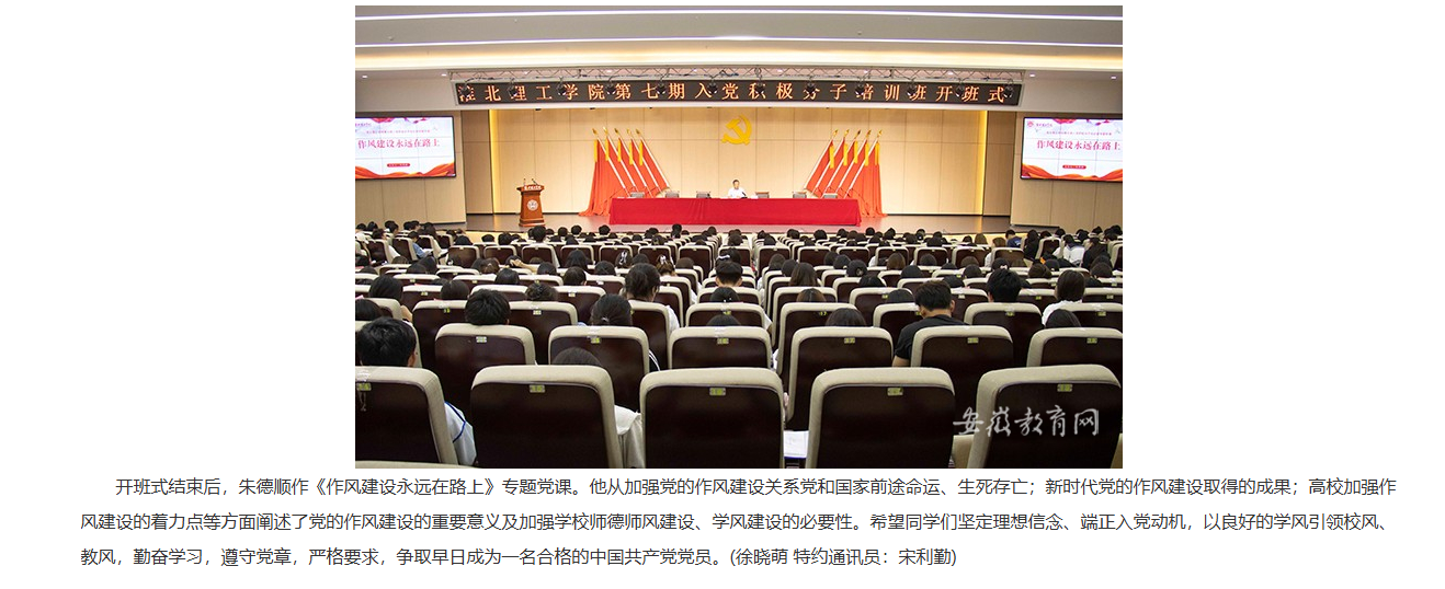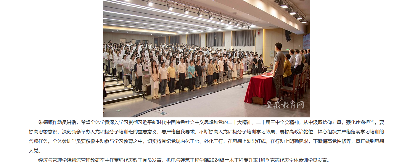 为深入贯彻落实党的二十大和二十届三中全会精神,认真贯彻习近平总书记关于党的建设的重要思想,做好党员发展工作,近日,beat365英国官方网站举行第七期入党积极分子培训班开班。校党委书记朱德顺,各党总支(直属党支部)书记、副书记,各党总支组织员、各党支部书记、全体参训学员参加。对此,安徽教育网进行了报道: