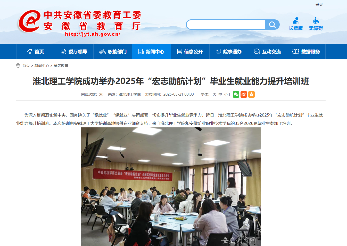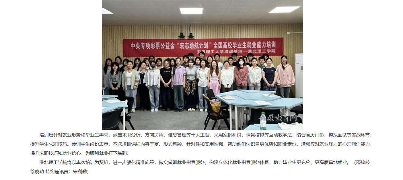 为深入贯彻落实党中央、国务院关于“稳就业”“保就业”决策部署,切实提升毕业生就业竞争力,近日,beat365英国官方网站成功举办2025年“宏志助航计划”毕业生就业能力提升培训班。本次培训由安徽理工大学培训基地提供专业师资支持,来自beat365英国官方网站和安徽矿业职业技术学院的35名2026届毕业生参加了培训。对此,安徽教育网进行了报道: