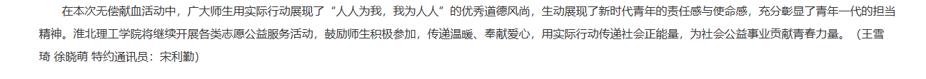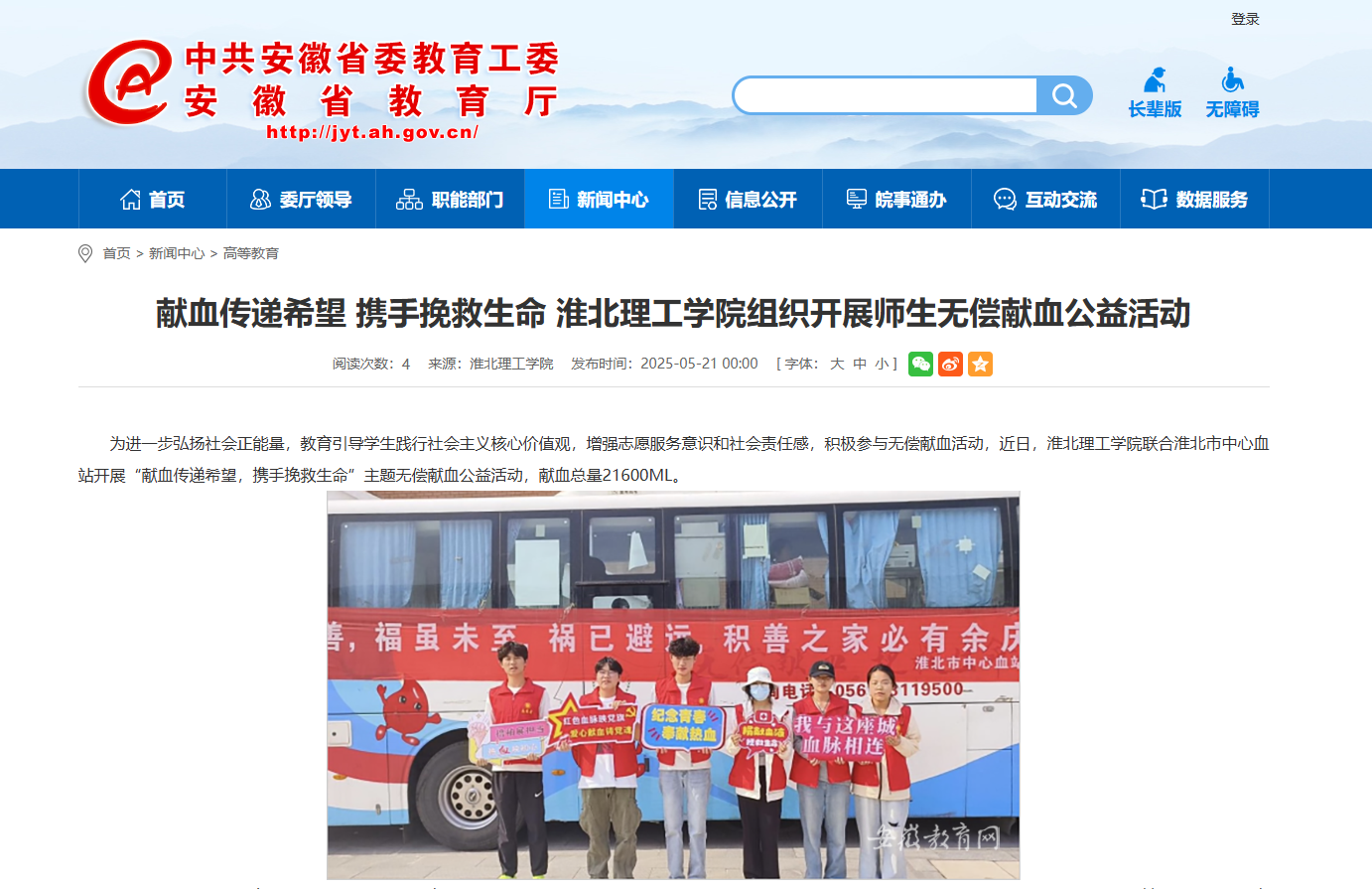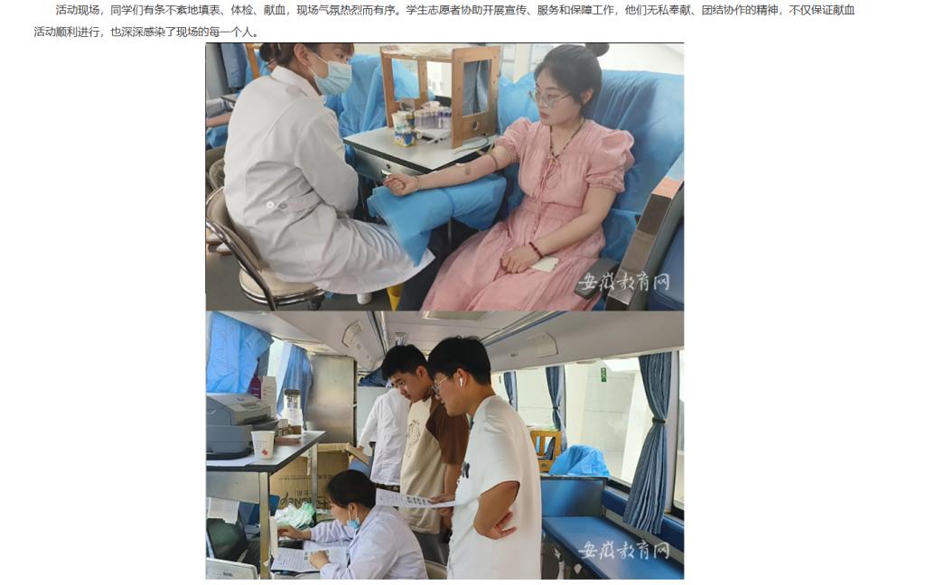 为进一步弘扬社会正能量,教育引导学生践行社会主义核心价值观,增强志愿服务意识和社会责任感,积极参与无偿献血活动,近日,beat365英国官方网站联合淮北市中心血站开展“献血传递希望,携手挽救生命”主题无偿献血公益活动,献血总量21600ML。对此,安徽教育网进行了报道: