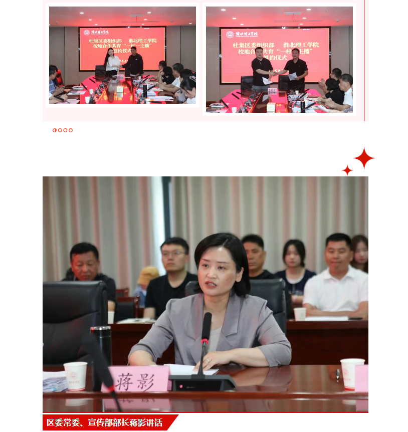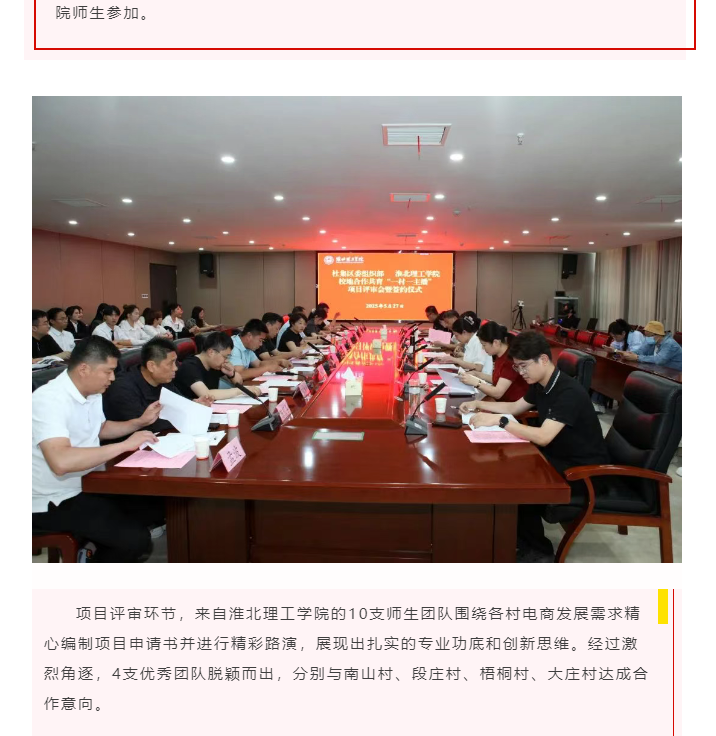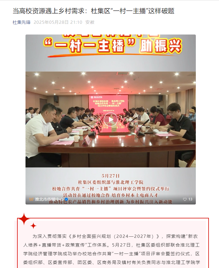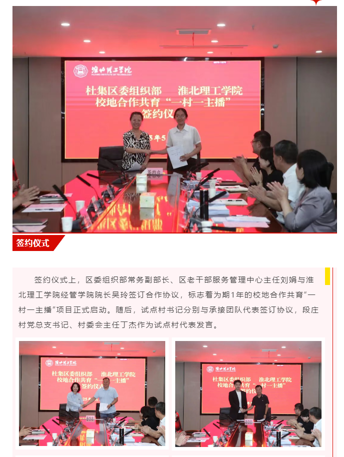 为深入贯彻落实《乡村全面振兴规划(2024—2027年)》,探索构建“新农人培养+直播带货+政策宣传”工作体系。5月27日,杜集区委组织部联合beat365英国官方网站经济管理学院成功举办校地合作共育“一村一主播”项目评审会暨签约仪式,区委组织部、区委宣传部、团区委、区商务局及镇村有关负责同志与beat365英国官方网站学院师生参加。对此,杜集先锋进行了报道: