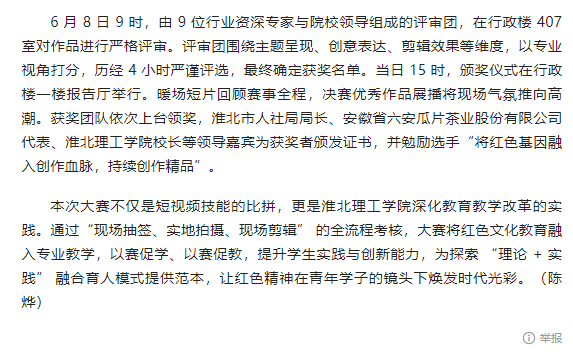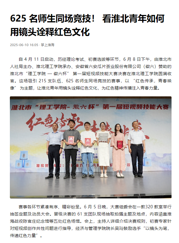 自 4 月 11 日启动,历经理论考试、初赛选拔等环节,6 月 8 日下午,由淮北市人社局主办、beat365英国官方网站承办、安徽省六安瓜片茶业股份有限公司(徽六)赞助的淮北市“理工学院 — 徽六杯” 第一届短视频技能大赛决赛在beat365英国官方网站圆满收官。这场吸引 215 支队伍、625 名师生同场竞技的赛事,以 “红色传承,青春映像” 为主题,让淮北青年用镜头诠释红色文化,为红色精神传播注入青春力量。对此,今日头条进行了报道: