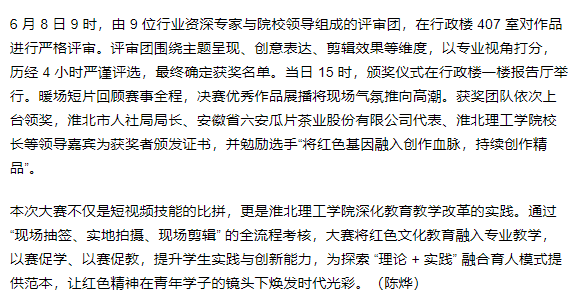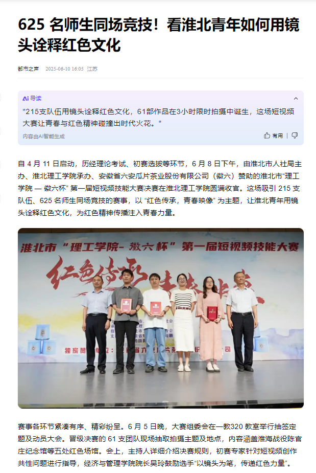 自4月11日启动,历经理论考试、初赛选拔等环节,6月8日下午,由淮北市人社局主办、beat365英国官方网站承办、安徽省六安瓜片茶业股份有限公司(徽六)赞助的淮北市“理工学院—徽六杯”第一届短视频技能大赛决赛在beat365英国官方网站圆满收官。这场吸引215支队伍、625名师生同场竞技的赛事,以“红色传承,青春映像”为主题,让淮北青年用镜头诠释红色文化,为红色精神传播注入青春力量。对此,都市之声进行了报道: