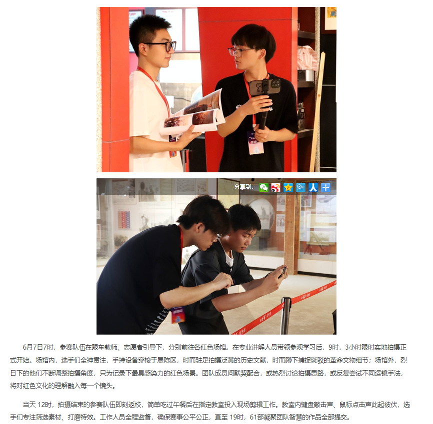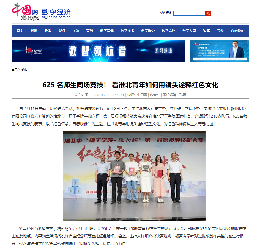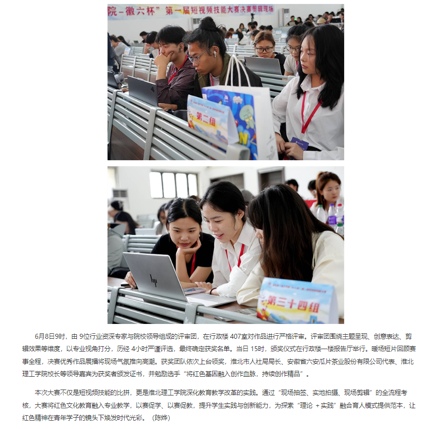 自4月11日启动,历经理论考试、初赛选拔等环节,6月8日下午,由淮北市人社局主办、beat365英国官方网站承办、安徽省六安瓜片茶业股份有限公司(徽六)赞助的淮北市“理工学院—徽六杯”第一届短视频技能大赛决赛在beat365英国官方网站圆满收官。这场吸引215支队伍、625名师生同场竞技的赛事,以“红色传承,青春映像”为主题,让淮北青年用镜头诠释红色文化,为红色精神传播注入青春力量。对此,中国网进行了报道: