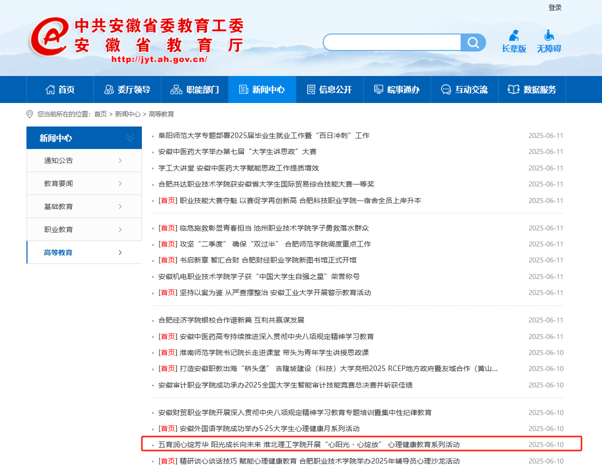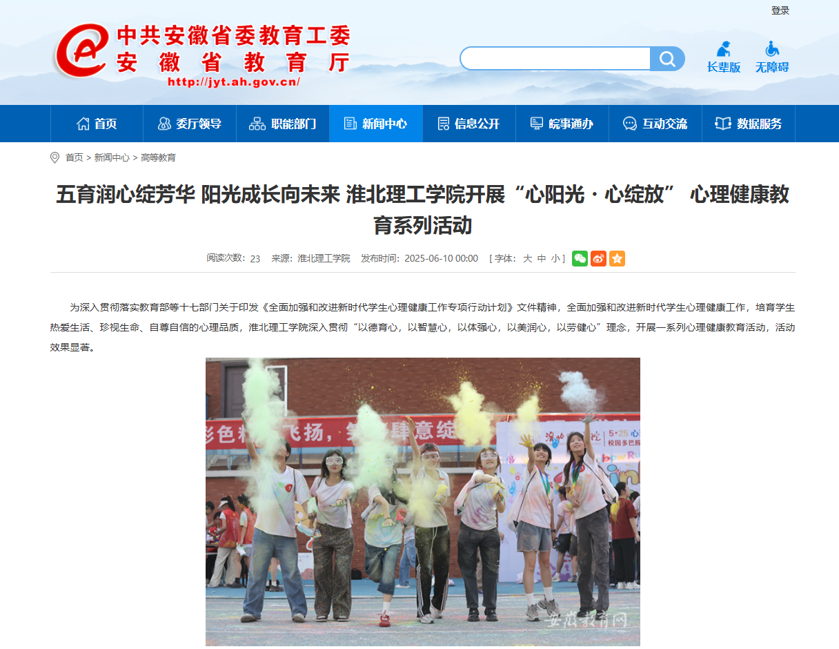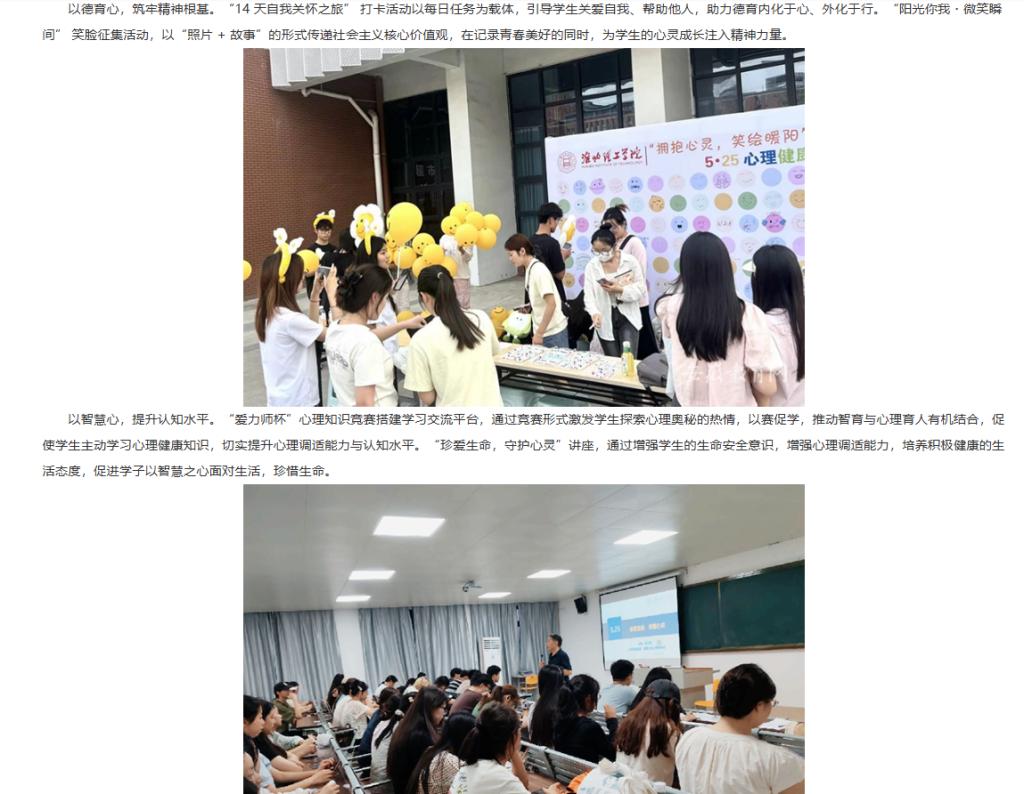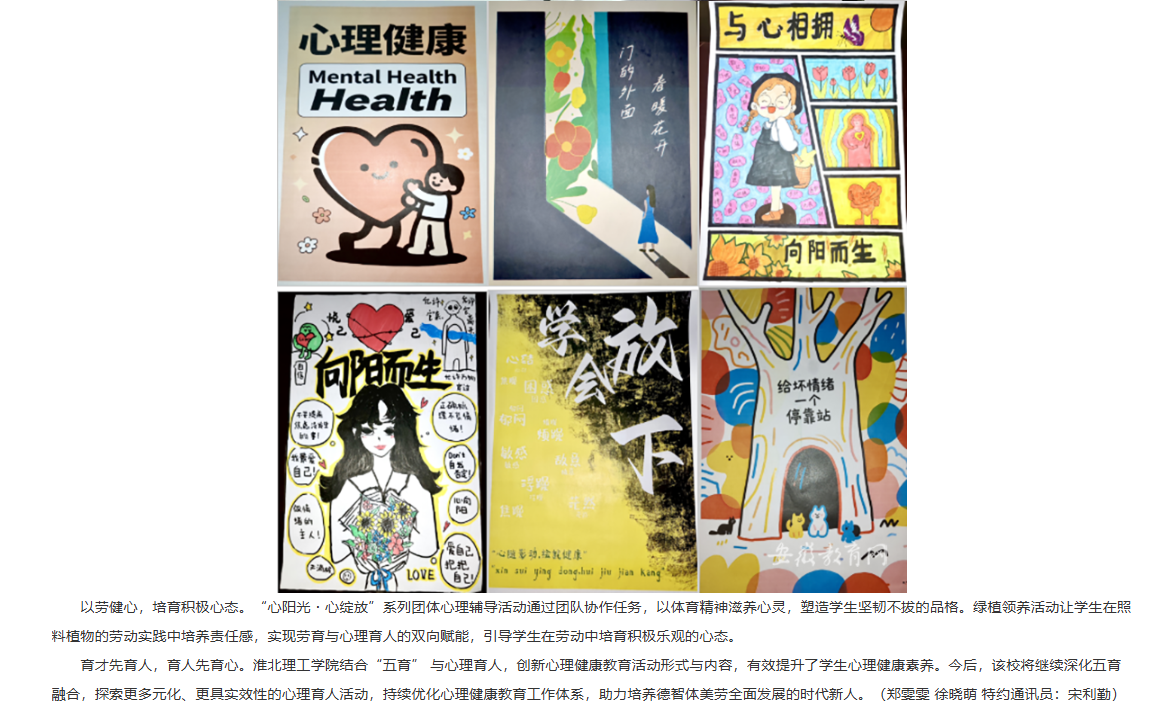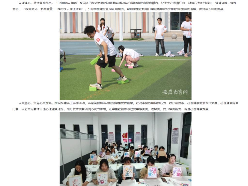 为深入贯彻落实教育部等十七部门关于印发《全面加强和改进新时代学生心理健康工作专项行动计划》文件精神,全面加强和改进新时代学生心理健康工作,培育学生热爱生活、珍视生命、自尊自信的心理品质,beat365英国官方网站深入贯彻“以德育心,以智慧心,以体强心,以美润心,以劳健心”理念,开展一系列心理健康教育活动,活动效果显著。对此,安徽教育网进行了报道: