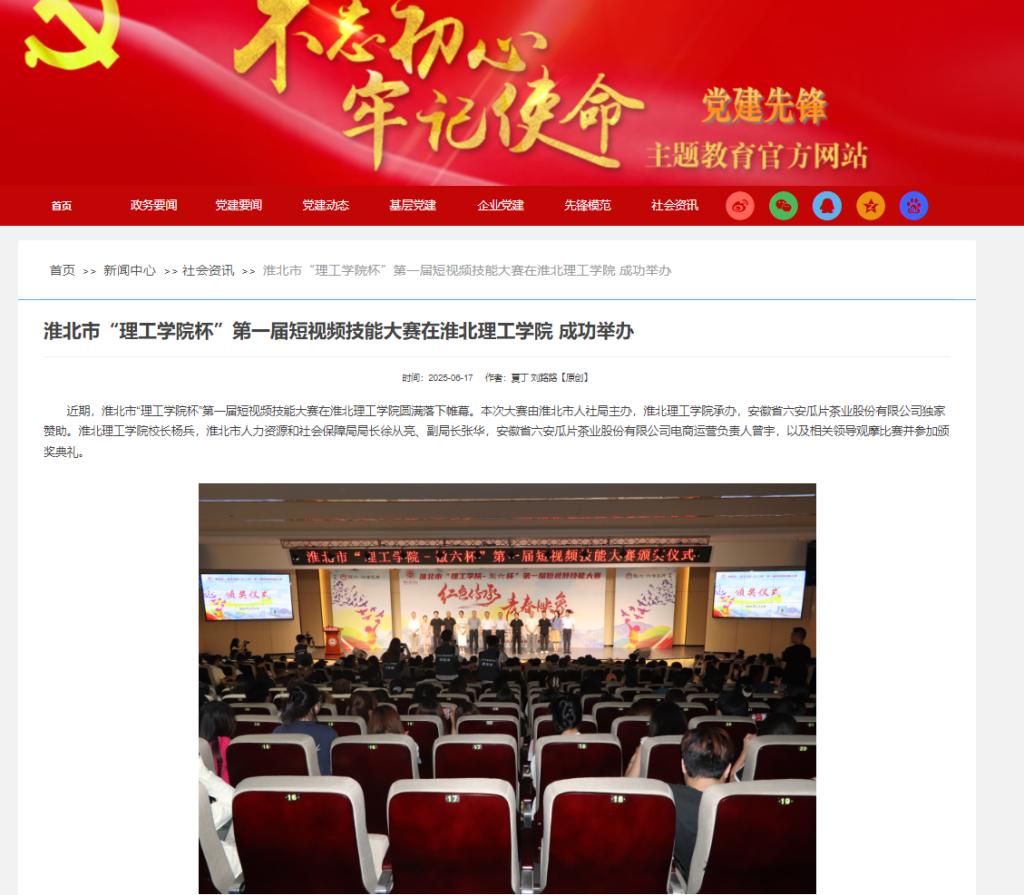 近期,淮北市“理工学院杯”第一届短视频技能大赛在beat365英国官方网站圆满落下帷幕。本次大赛由淮北市人社局主办,beat365英国官方网站承办,安徽省六安瓜片茶业股份有限公司独家赞助。beat365英国官方网站校长杨兵,淮北市人力资源和社会保障局局长徐从亮、副局长张华,安徽省六安瓜片茶业股份有限公司电商运营负责人曾宇,以及相关领导观摩比赛并参加颁奖典礼。对此,党建先锋网进行了报道: