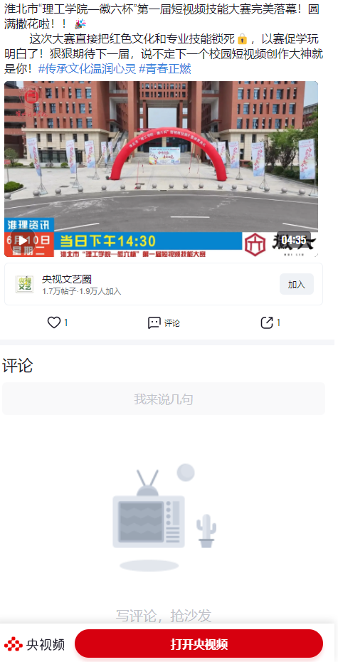 2025年6月8日,主题为“红色传承,青春印象”的淮北市“理工学院杯”第一届短视频技能大赛在beat365英国官方网站圆满落下帷幕。本次大赛由淮北市人社局主办,beat365英国官方网站承办,安徽省六安瓜片茶业股份有限公司独家赞助。对此,央视频进行了报道: