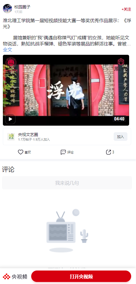 beat365英国官方网站第一届短视频技能大赛一等奖优秀作品《浮光》讲述了展馆兼职的“我”偶遇自称煤气灯“成精”的女孩,她能听见文物说话,熟知抗战手榴弹、褪色军装等展品的鲜活往事。曾被遗忘的她想帮“我”实现让文物老师被人熟知的计划,而“我”在她留下的“微光亦能照亮黑暗”的鼓励下,重启了解文物、制作视频、演讲等行动。感叹“历史如浮光”,故事在铭记历史、薪火相传的呼唤中落幕。对此,央视频进行了报道: