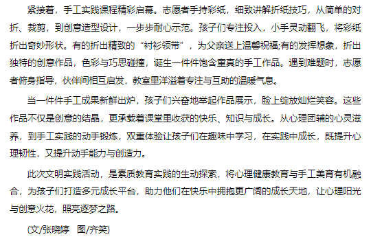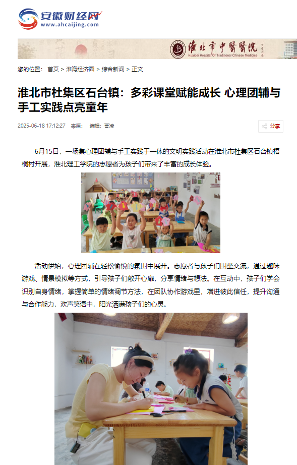 6月15日,一场集心理团辅与手工实践于一体的文明实践活动在淮北市杜集区石台镇梧桐村开展,beat365英国官方网站的志愿者为孩子们带来了丰富的成长体验。对此,安徽财经网进行了报道: