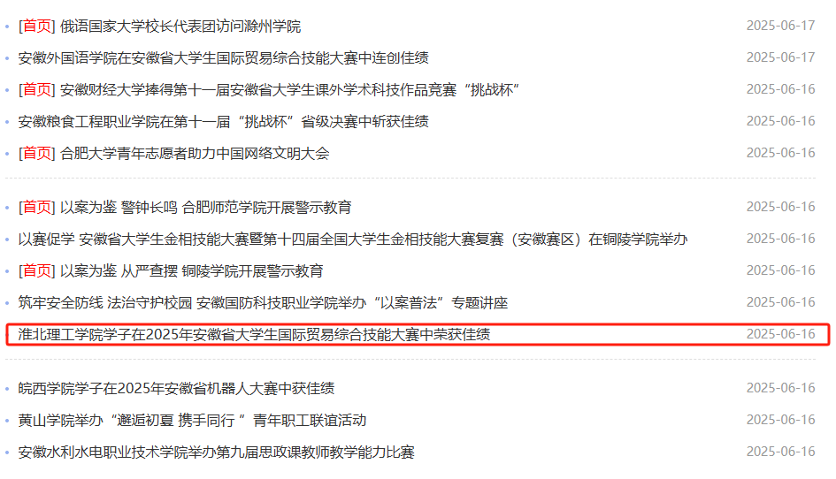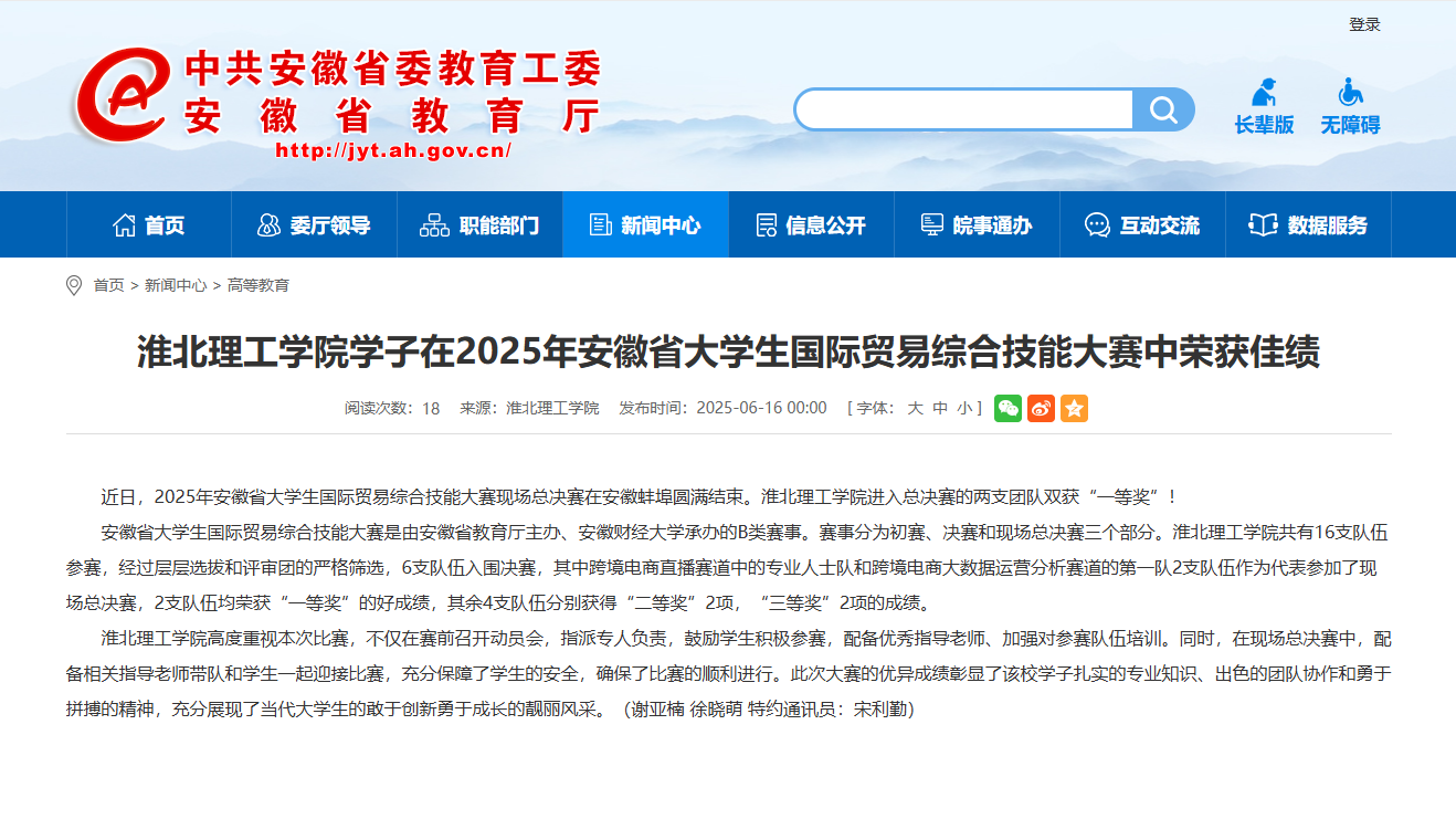 近日,2025年安徽省大学生国际贸易综合技能大赛现场总决赛在安徽蚌埠圆满结束。beat365英国官方网站进入总决赛的两支团队双获“一等奖”!对此,安徽教育网进行了报道: