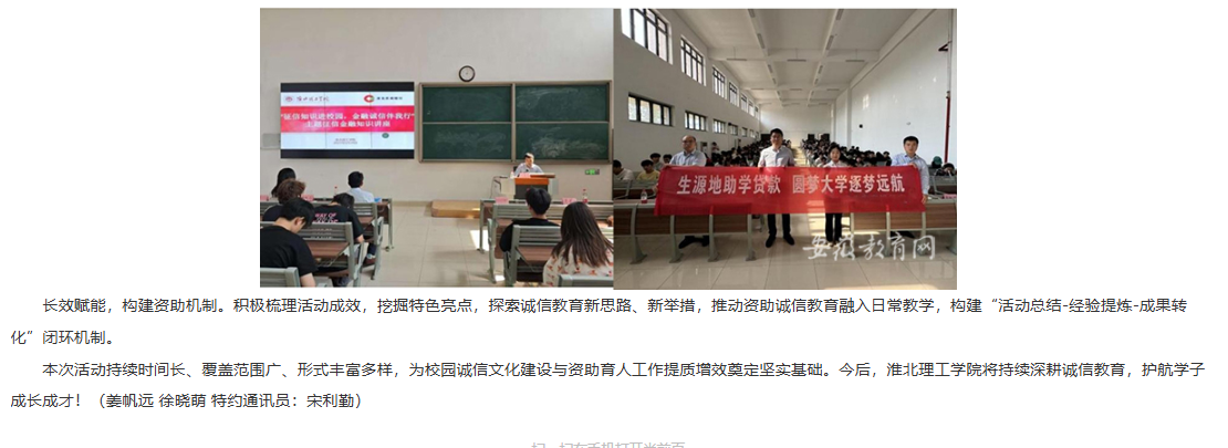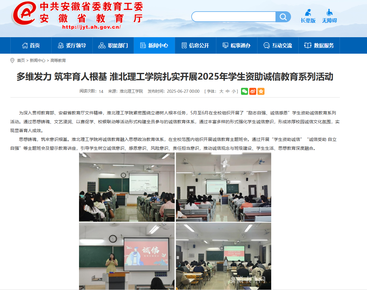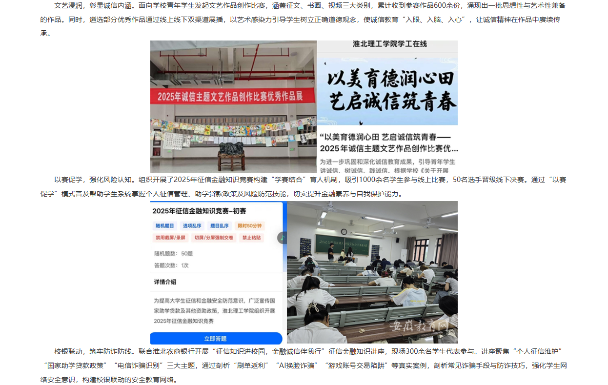 为深入贯彻教育部、安徽省教育厅文件精神,beat365英国官方网站紧密围绕立德树人根本任务,5月至6月在全校组织开展了“励志自强、诚信感恩”学生资助诚信教育系列活动。通过思想铸魂、文艺浸润、以赛促学、校银联动等活动形式构建全员参与的诚信教育体系,通过丰富多样的形式强化学生诚信意识,形成浓厚校园诚信文化氛围,实现显著育人成效。对此,安徽教育网进行了报道: