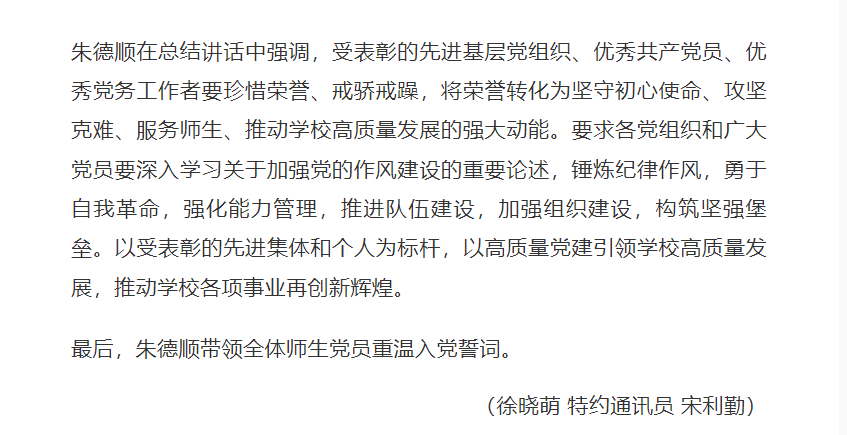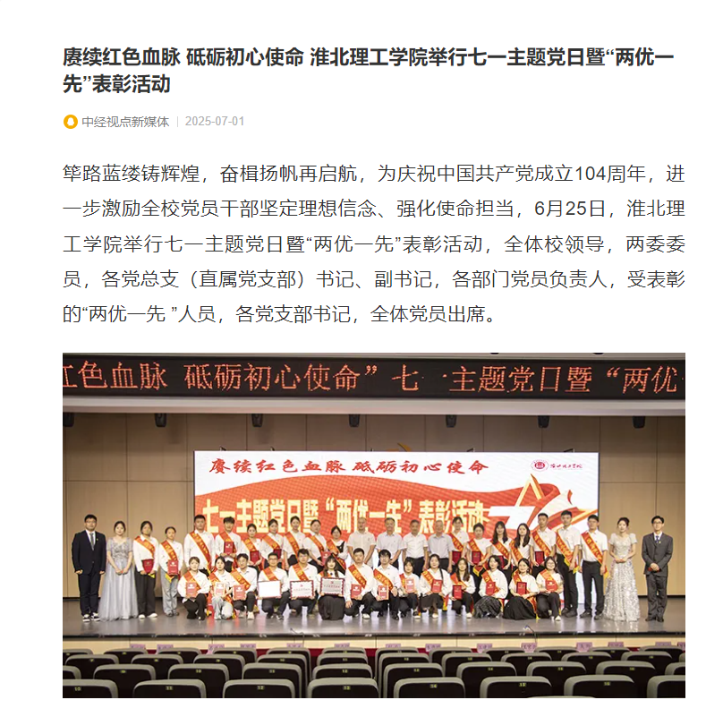 筚路蓝缕铸辉煌,奋楫扬帆再启航,为庆祝中国共产党成立104周年,进一步激励全校党员干部坚定理想信念、强化使命担当,6月25日,beat365英国官方网站举行七一主题党日暨“两优一先”表彰活动,全体校领导,两委委员,各党总支(直属党支部)书记、副书记,各部门党员负责人,受表彰的“两优一先 ”人员,各党支部书记,全体党员出席。对此,中经视点新媒体进行了报道: