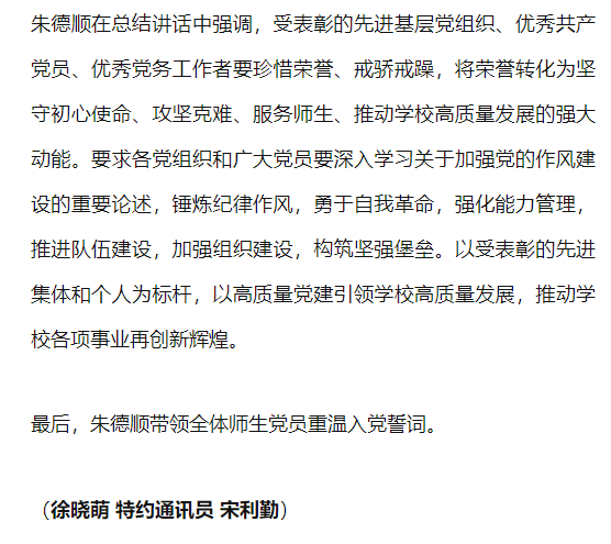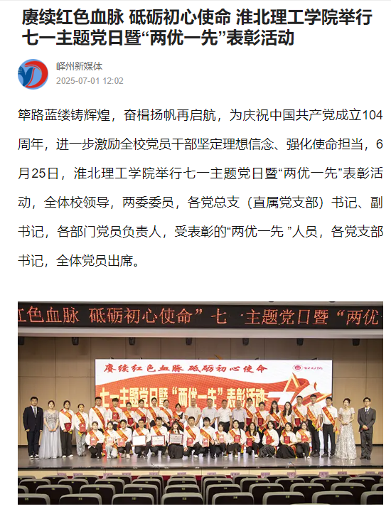 筚路蓝缕铸辉煌,奋楫扬帆再启航,为庆祝中国共产党成立104周年,进一步激励全校党员干部坚定理想信念、强化使命担当,6月25日,beat365英国官方网站举行七一主题党日暨“两优一先”表彰活动,全体校领导,两委委员,各党总支(直属党支部)书记、副书记,各部门党员负责人,受表彰的“两优一先 ”人员,各党支部书记,全体党员出席。对此,峄州新媒体进行了报道: